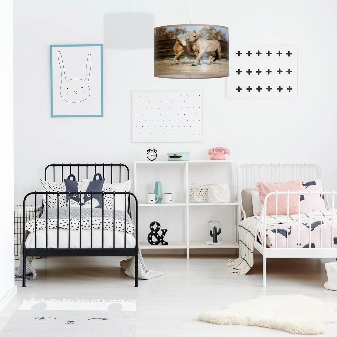Lampy Horses to nowoczesne oświetlenie. W skład serii wchodzą: plafon i zwis sufitowy z trzema źródłami światła oraz kinkiet i lampka biurkowa z jednym źródłem światła. Elementem wyróżniającym oświetlenie Horses są wielokolorowe abażury z grafiką, na której zamieszczono galopujące konie. Lampa świeci przyjemnym, nie męczącym oczu ciepłym białym światłem. Do oświetlania zaleca się stosowanie żarówek LED z gwintem E27. Dodając do pomieszczenia pozostałe lampy z kolekcji można stworzyć spójną i kompletną aranżację. Producent udziela na lampy 24-miesięcznej gwarancji, w ramach której świadczy nieodpłatnie usługi gwarancyjne.