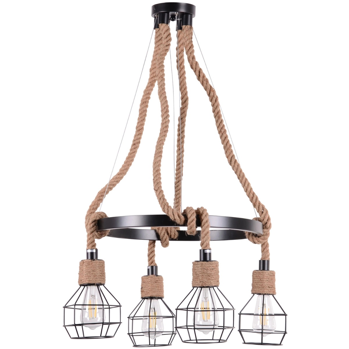 Lampa wisząca Rope Alegra marki GOLDLUX w kolorze czarno-beżowym w loftowym stylu wykonana z metalu w kolorze czarnym oraz sznura konopnego. Składa się z metalowej obręczy, na której zawieszono cztery małe klosze z drucików. Klosze te zaczepione są na sznurze i przeplecione przez obręcz, co tworzy interesujący efekt, przypominający stare lampy oświetleniowe. Lampa posiada cztery punkty świetlne, idealne jako oświetlenie główne w stylu loftowym i industrialnym. Ze względu na odkryte źródło światła, do lampy polecamy żarówki ozdobne z serii FILAMENT dla wspaniałego wykończenia i nadania dekoracyjnego charakteru. Ta lampa to produkt idealny dla każdego, kto pragnie udekorować swoje mieszkanie niepowtarzalnym i nieszablonowym dodatkiem, który będzie podkreślał oryginalny wystrój wnętrza. Zawieszona w centralnym miejscu będzie cieszącą oczy ozdobą.