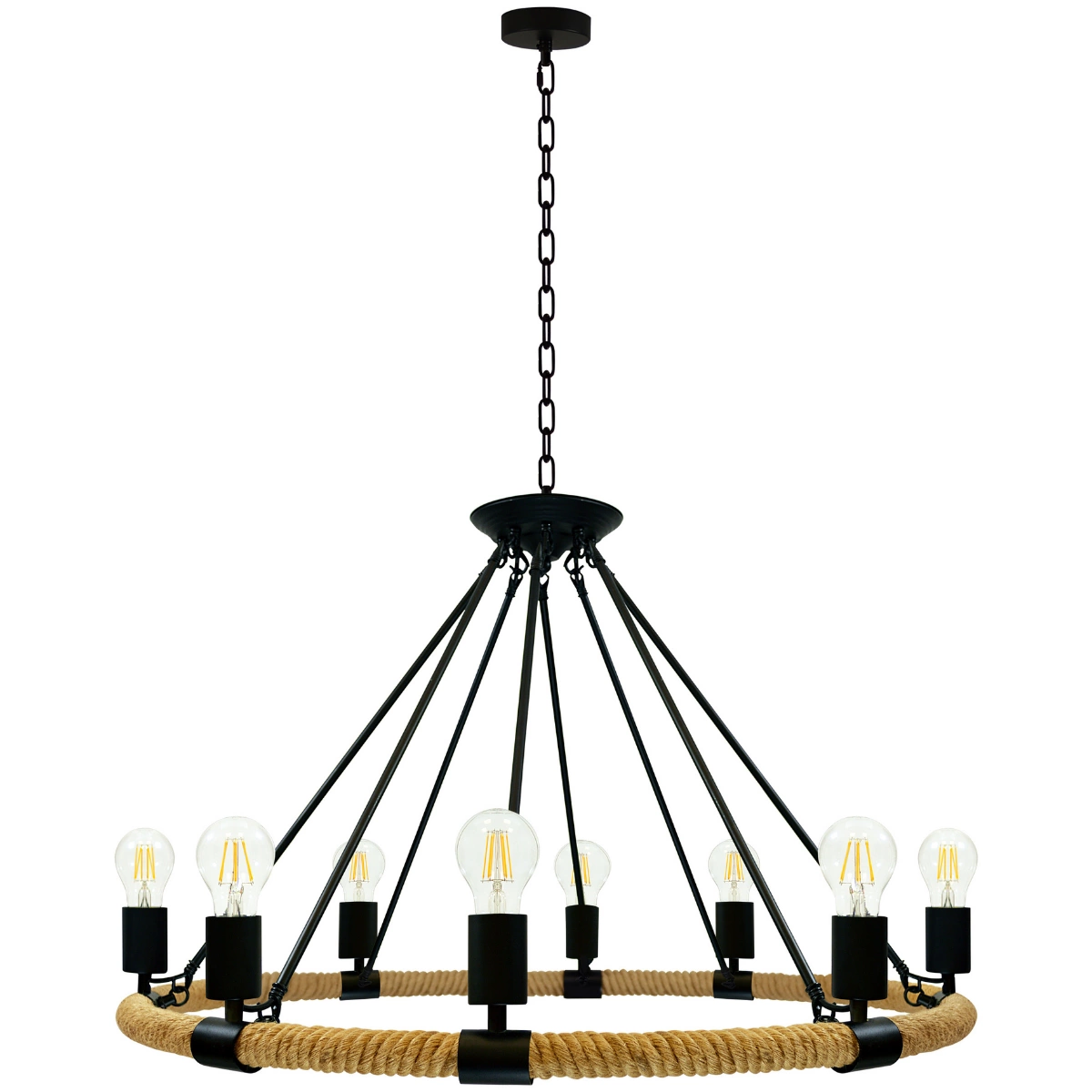 Lampa wisząca ROPE ARTHUR marki GOLDLUX(Polux) z ośmioma punktami świetlnymi, stanowi wyjątkową propozycję, przeznaczoną do wnętrz o charakterze rustykalnym, klasycznym i industrialnym. Z uwagi na swój intrygujący design i metalowe wykończenie, znakomicie wpisuje się także w loftowe przestrzenie, gdzie doskonale prezentuje się na tle betonu, drewna, czy surowej cegły. Będzie dobrze współgrać również ze ścianami w pastelowych barwach, a także w modnej butelkowej zieleni, grafitu i granatu. Lampa świetnie sprawdzi się jako główne źródło światła w salonie. Można ją zawiesić również nad stołem w jadalni, kuchenną wyspą, a nawet w sypialni. Wspaniale prezentuje się w połączeniu z żarówkami typu FILAMENT.