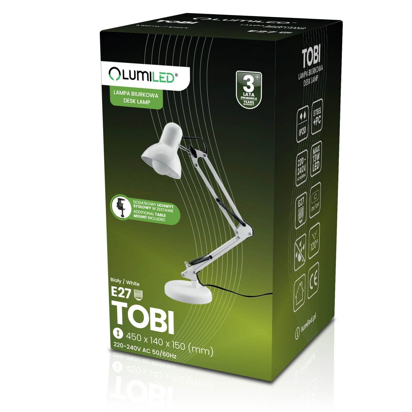 Lampa biurkowa TOBI marki Lumiled to praktyczne i stylowe rozwiązanie dla każdego, kto potrzebuje funkcjonalnego oświetlenia przy pracy, nauce lub czytaniu. Dzięki gniazdu E27 dopasujesz żarówkę LED do swoich preferencji – od ciepłego, nastrojowego światła po jasne, sprzyjające koncentracji. Solidna stalowa konstrukcja łączy trwałość z elegancją, a dodatkowy uchwyt stołowy w zestawie pozwala oszczędzić miejsce i wygodnie zamocować lampę. To uniwersalny wybór zarówno do biura, jak i pokoju młodzieżowego.