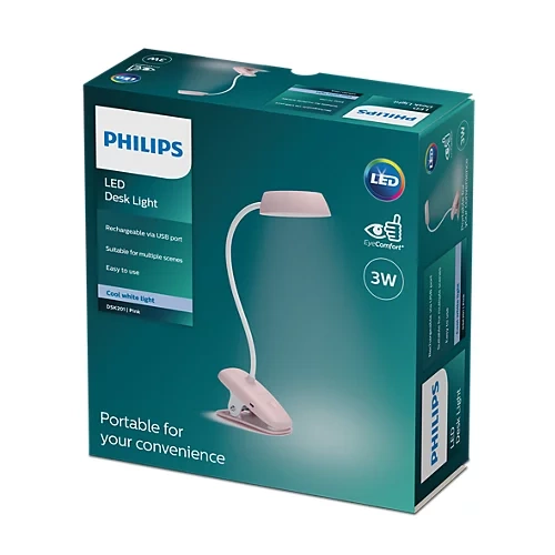 Lampka biurkowa Philips Donutclip DSK201 to eleganckie i funkcjonalne rozwiązanie oświetleniowe dla nowoczesnych wnętrz. Wyposażona w energooszczędne diody LED o mocy 3W, dostarcza przyjemne światło o jasności 175 lumenów i neutralnej barwie 4000K, co sprzyja komfortowi pracy i nauki. Ten model, o unikalnym designie przypominającym kształt donuta w subtelnym różowym kolorze, doskonale wpasuje się w każde biuro czy pokój dziecięcy, dodając wnętrzu świeżości i stylu. Dzięki praktycznemu uchwytowi klips, lampka może być łatwo przymocowana do biurka lub półki, co pozwala na oszczędność miejsca oraz dowolne ustawienie kąta padania światła. Technologia LED zapewnia do 15 000 godzin pracy, co czyni ten produkt wytrzymałym i ekologicznym wyborem. Funkcjonalność lampki dodatkowo zwiększa zasilanie przez USB, umożliwiając łatwe podłączenie do komputerów, powerbanków czy adapterów sieciowych. To idealny wybór dla osób ceniących sobie połączenie estetyki z nowoczesną technologią.