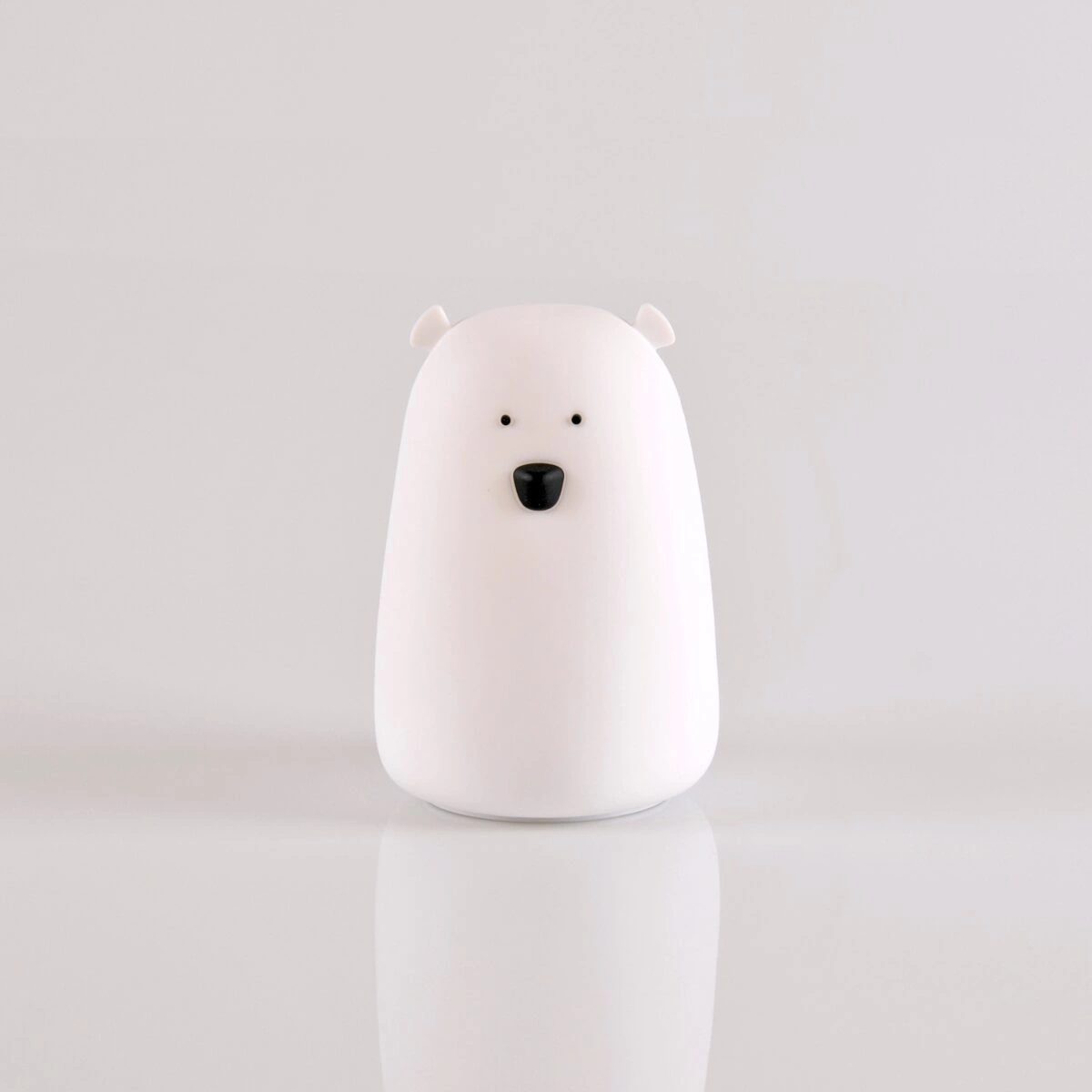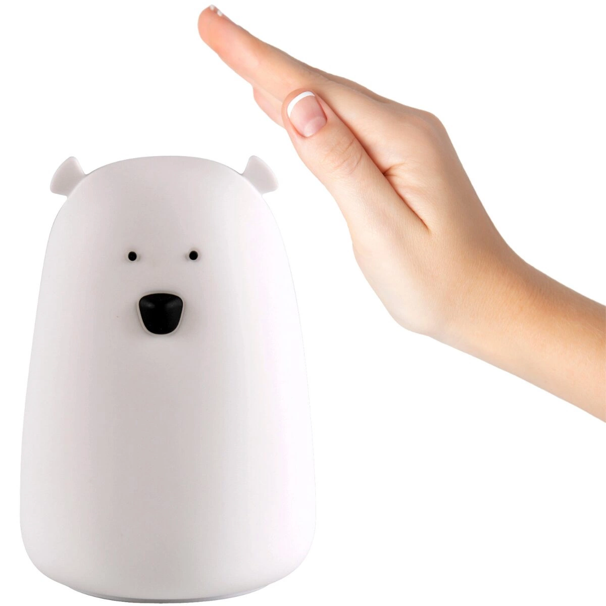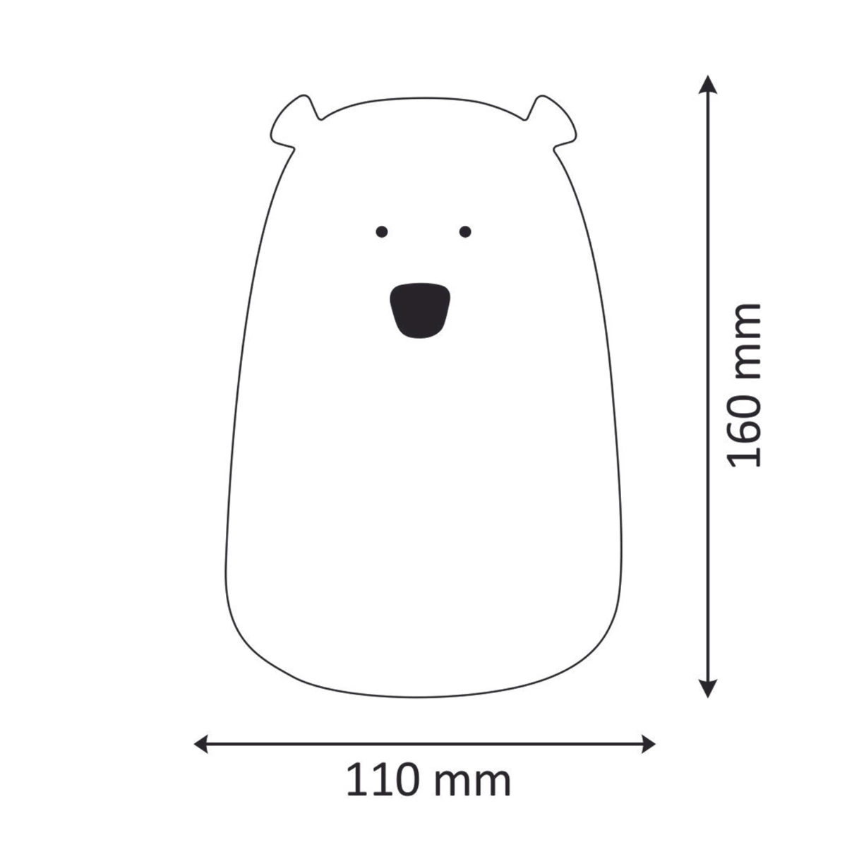 Sylikonowa Lampa DEKORACYJNA LED MIŚ TAP TAP marki POLUX w kolorze białym, emitująca białe ciepłe jak i kolorowe światło RGB. Jej wygląd przypominający białego misia sprawia że nadaje się ona do pokoju dziecięcego. Lampka została wyposażona w zintegrowane źródło światła LED o mocy znamionowej 0,4W emitujące strumień świetlny maksymalnie do 20lm. MIŚ TAP TAP to lampka dekoracyjna wyposażona w akumulator o pojemności 1200mAh dzięki czemu możemy ją używać w różnych miejscach. Orientacyjny czas użytkowania lampki na pełnej baterii to 15h przy świetle białym 3000K i 12h przy świetle kolorowym RGB, zaś sam czas ładowania baterii to 3h. Do lampki dołączony jest kabel USB za pomocą którego możemy naładować nasze urządzenie podpinając go np. do laptopa lub komputera