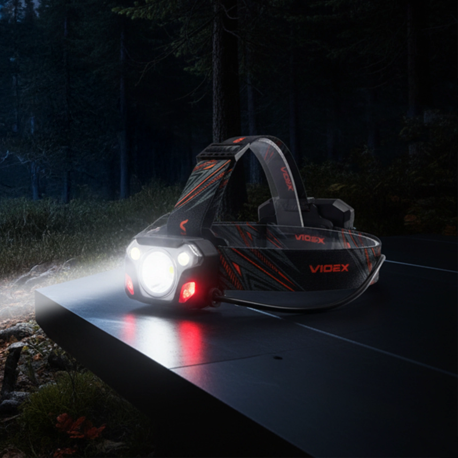 - 5 trybów pracy: HIGH, LOW, STROBE, RED ON, RED FLASH — pełna kontrola nad intensywnością i charakterem światła.