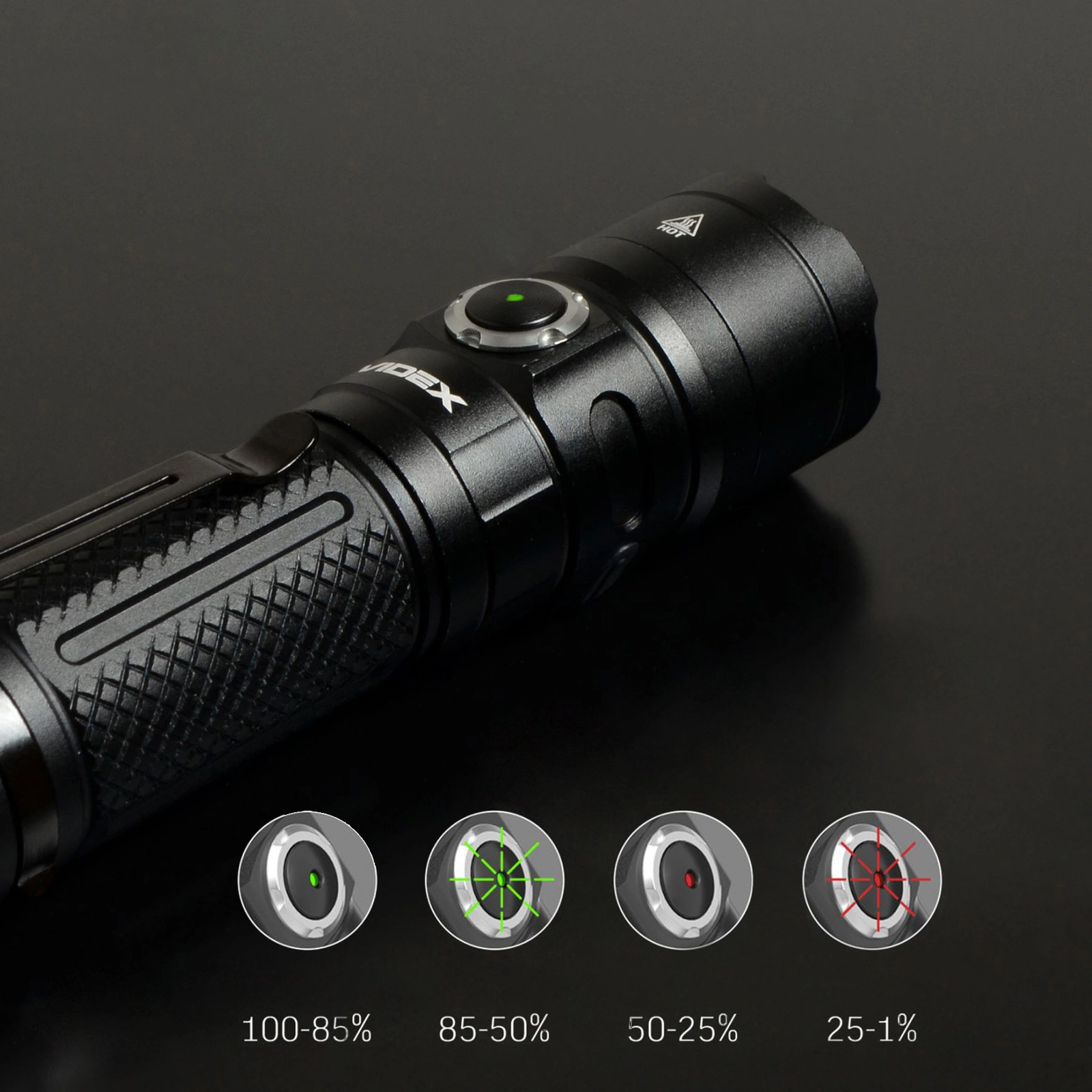 Czteropoziomowy wskaźnik LED, który informuje o stanie akumulatora w czasie pracy lub ładowania. Zielone światło oznacza pełne naładowanie (100–85%), jasnozielone – średni poziom (85–50%), pomarańczowe wskazuje niski poziom (50–25%), a czerwone sygnalizuje konieczność naładowania (poniżej 25%). Dzięki temu zawsze wiesz, kiedy warto podłączyć latarkę do ładowania.