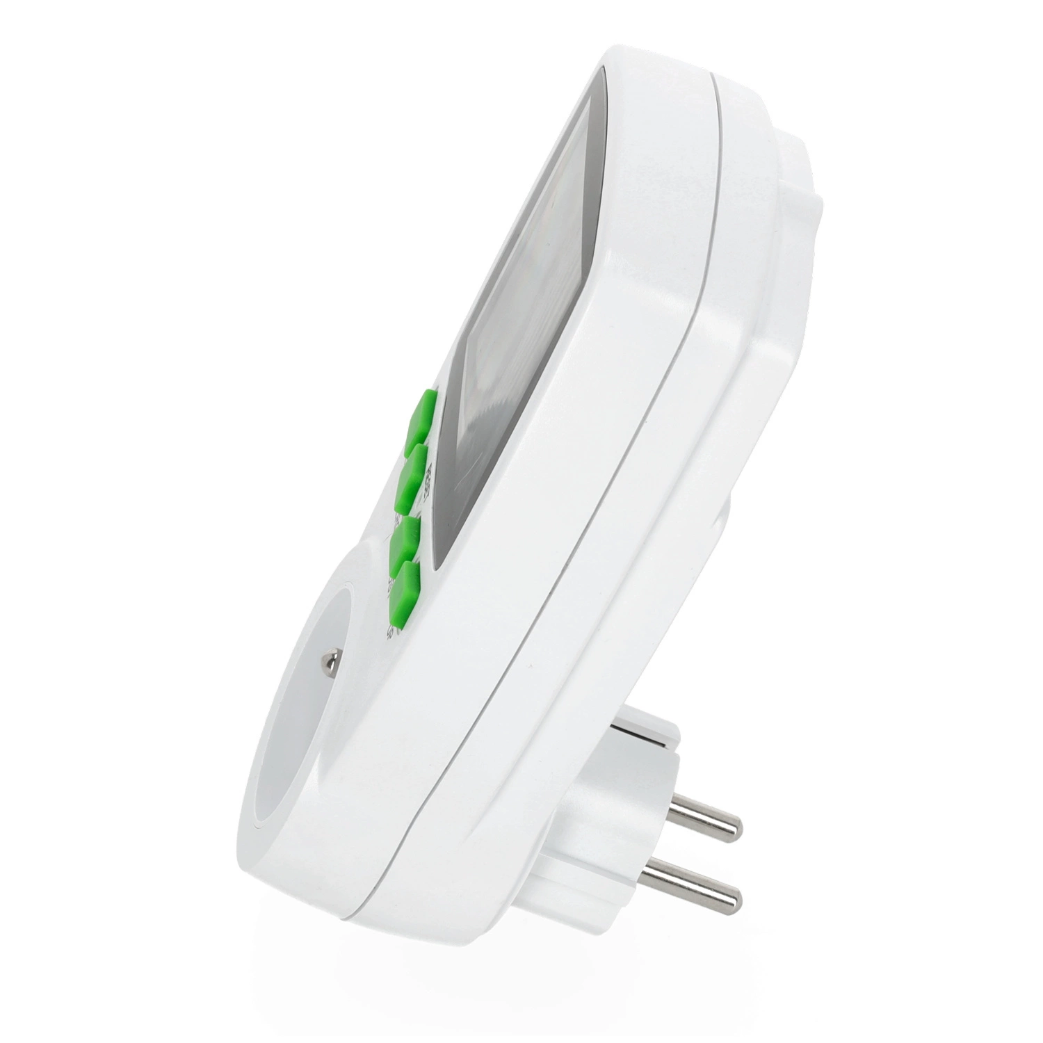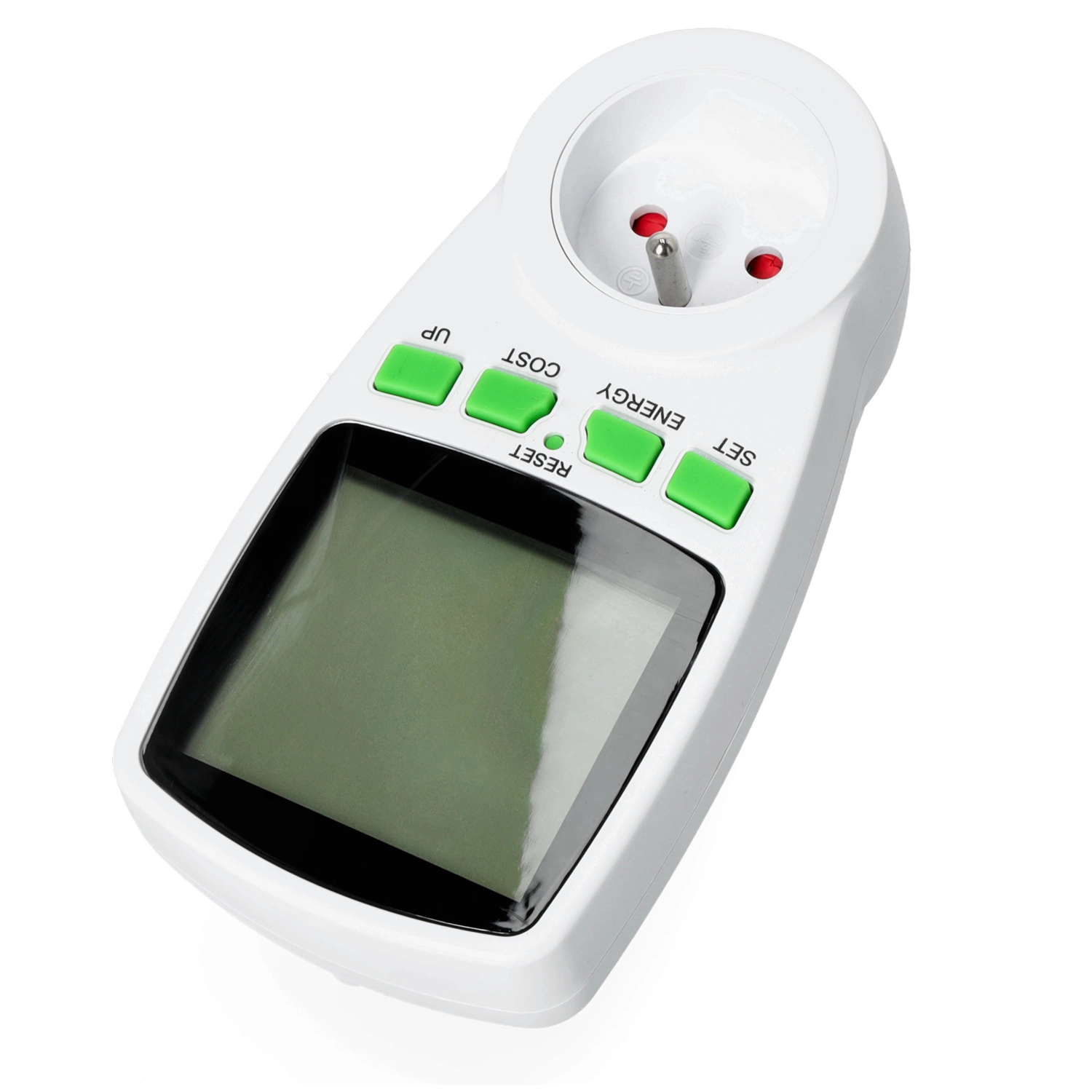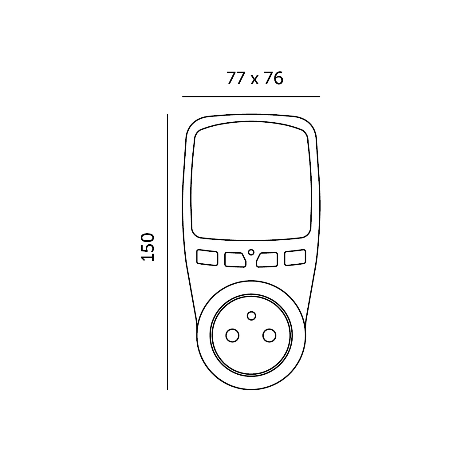 Miernik wyświetla również szczegółowe dane techniczne, takie jak napięcie [V], natężenie prądu [A], częstotliwość [Hz], współczynnik mocy [DF] oraz bieżący pobór mocy [W]. Posiada funkcję pamięci, która zapisuje ustawienia i dane zbiorcze, nawet po odłączeniu, dzięki dwóm bateriom LR44 (AG13), które są dołączone do zestawu. Dodatkowo, miernik oferuje funkcję przeciążenia z możliwością ustawienia limitu (maksymalna moc 3680W), a przekroczenie ustawionego limitu sygnalizowane jest migotaniem wyświetlacza. Miernik jest wyposażony w gniazdko z uziemieniem unischuko oraz przesłony torów prądowych, które chronią przed przypadkowym dostępem dzieci do gniazdka.