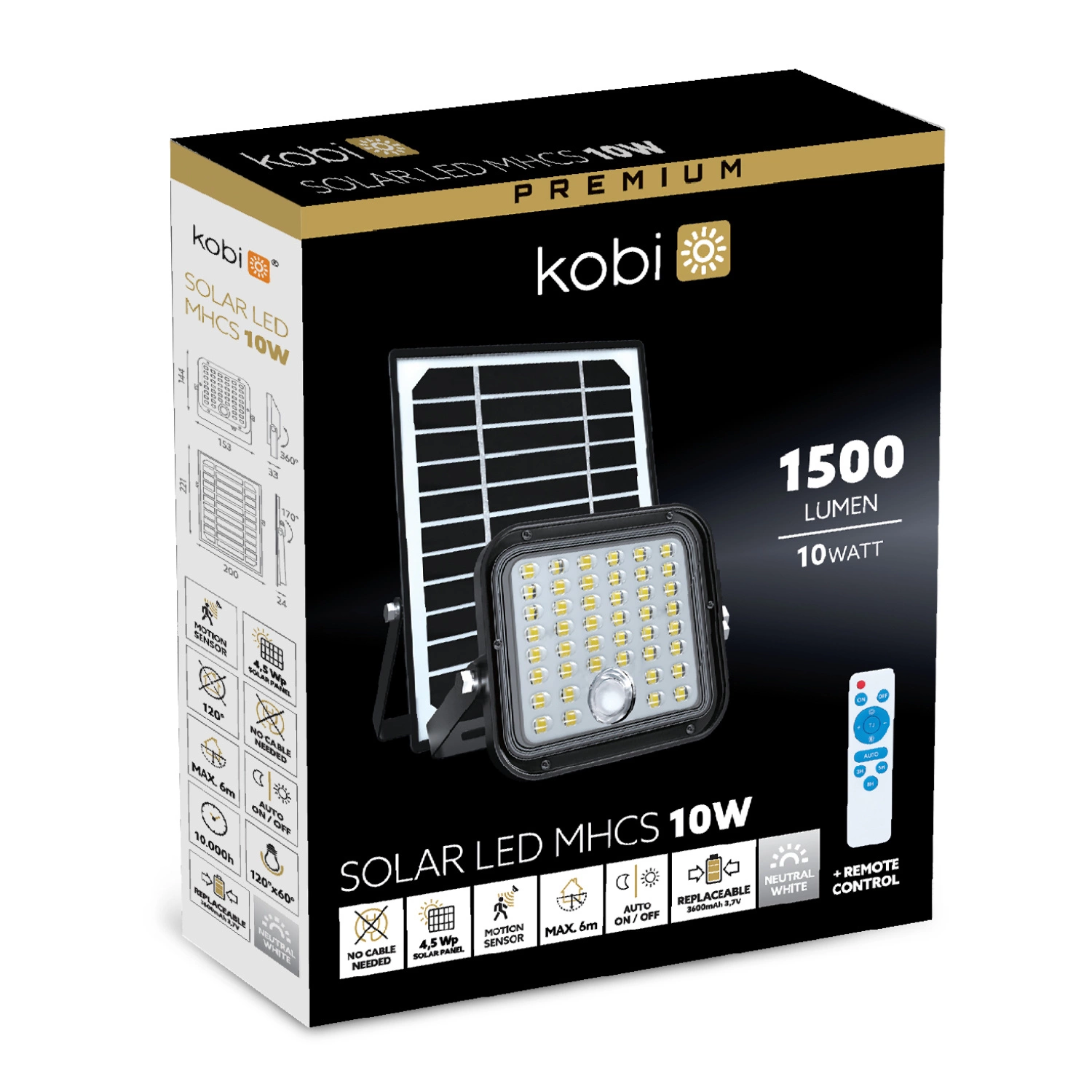 Naświetlacz LED Solarny Zewnętrzny Ogrodowy 10W 1500lm 4000K Neutralny 120° z Czujnikiem Ruchu i Zmierzchu IP65 Czarny MHCS Kobi