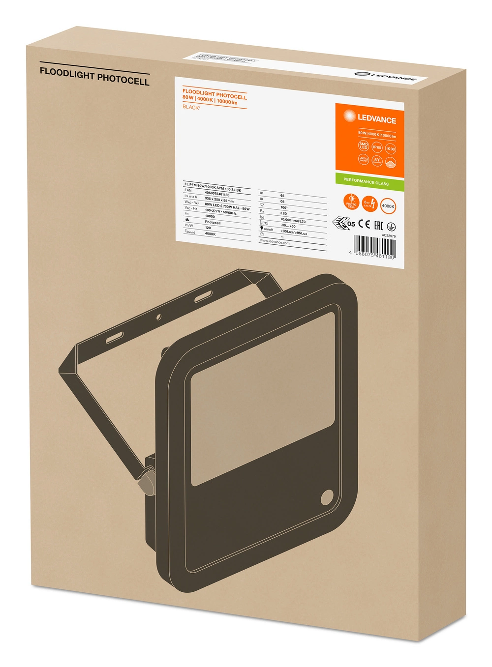Naświetlacz LED z wbudowanym czujnikiem zmierzchu, z serii FLOODLIGHT PHOTOCELL to wysokiej jakości produkt, który został wyprodukowany przez markę Ledvance. Naświetlacz LED emituje mocne światło o mocy 80W, strumieniu świetlnym 10000lm i neutralnej białej barwie ŚWIATŁA, która jest zbliżona do ŚWIATŁA dziennego. Oprawa led pozwala na automatyczne włączanie i wyłączanie w zależności od ilości dostępnego ŚWIATŁA dziennego. Naświetlacz z czujnikiem charakteryzuje się wysoką trwałością, która idzie w parze ze zgrabnym oraz eleganckim wyglądem. Lampa LED posiada zawsze włączoną opcję zasilania awaryjnego, aktywowaną przez specjalny schemat przełączania sieci. Reflektor posiada aluminiową obudowę oraz matowy klosz wykonany z hartowanego szkła, który zapewnia bardzo bezpieczne i równomierne oświetlenie. Naświetlacz z czujnikiem dzięki ochronie wynoszącej IP65 jest odporny na pył i wodę, dzięki czemu może być stosowany jako oświetlenie zewnętrzne. Naświetlacz świetnie sprawdzi się wszędzie tam, gdzie potrzeba niezawodnego i trwałego źródła ŚWIATŁA.