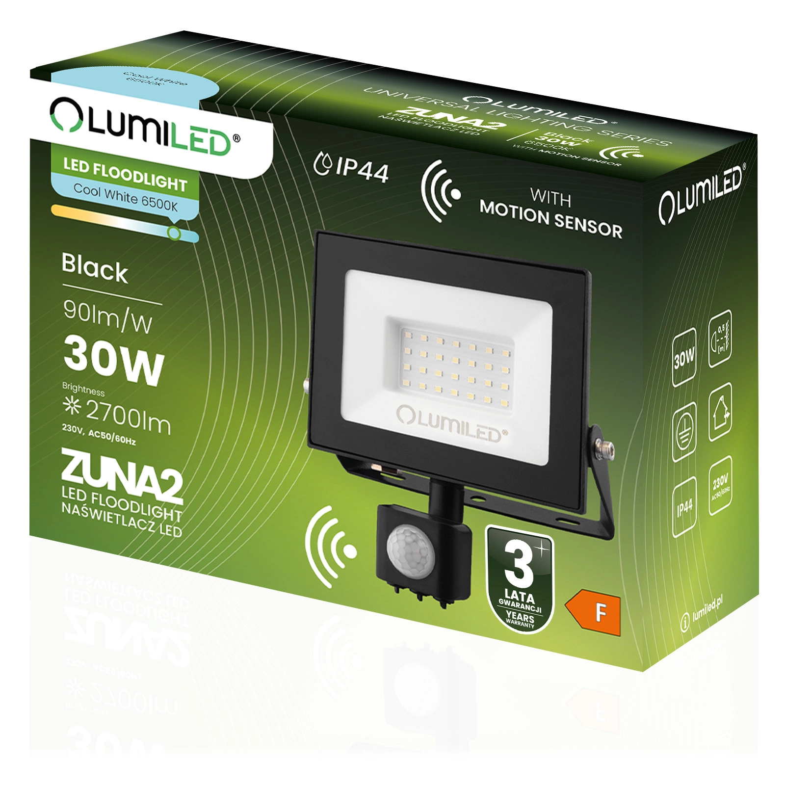 Naświetlacz LED ZUNA2 30W 2700lm 6500K IP44 Czarny Czujnik Ruchu LUMILED - pierwsza cecha produktu