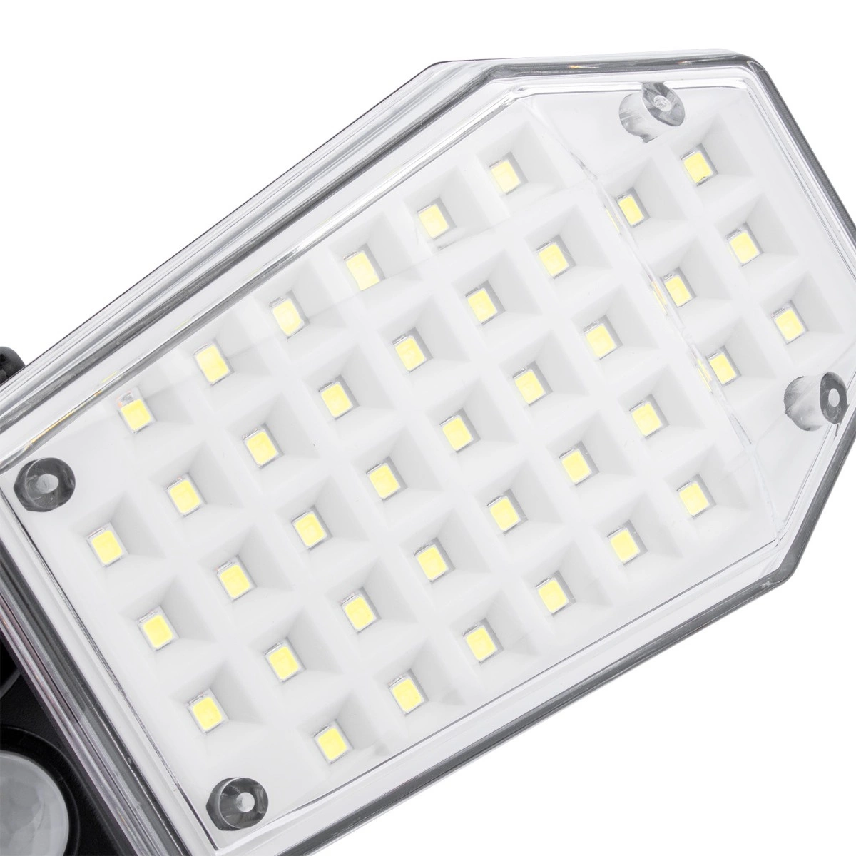 Naświetlacz posiada czujnik ruchu PIR o kącie działania 120° w zakresie 4 - 6 m. Produkt po wykryciu zmierzchu wchodzi w tryb czuwania i się nie świeci, po wykryciu ruchu zapala się na 100% jasności