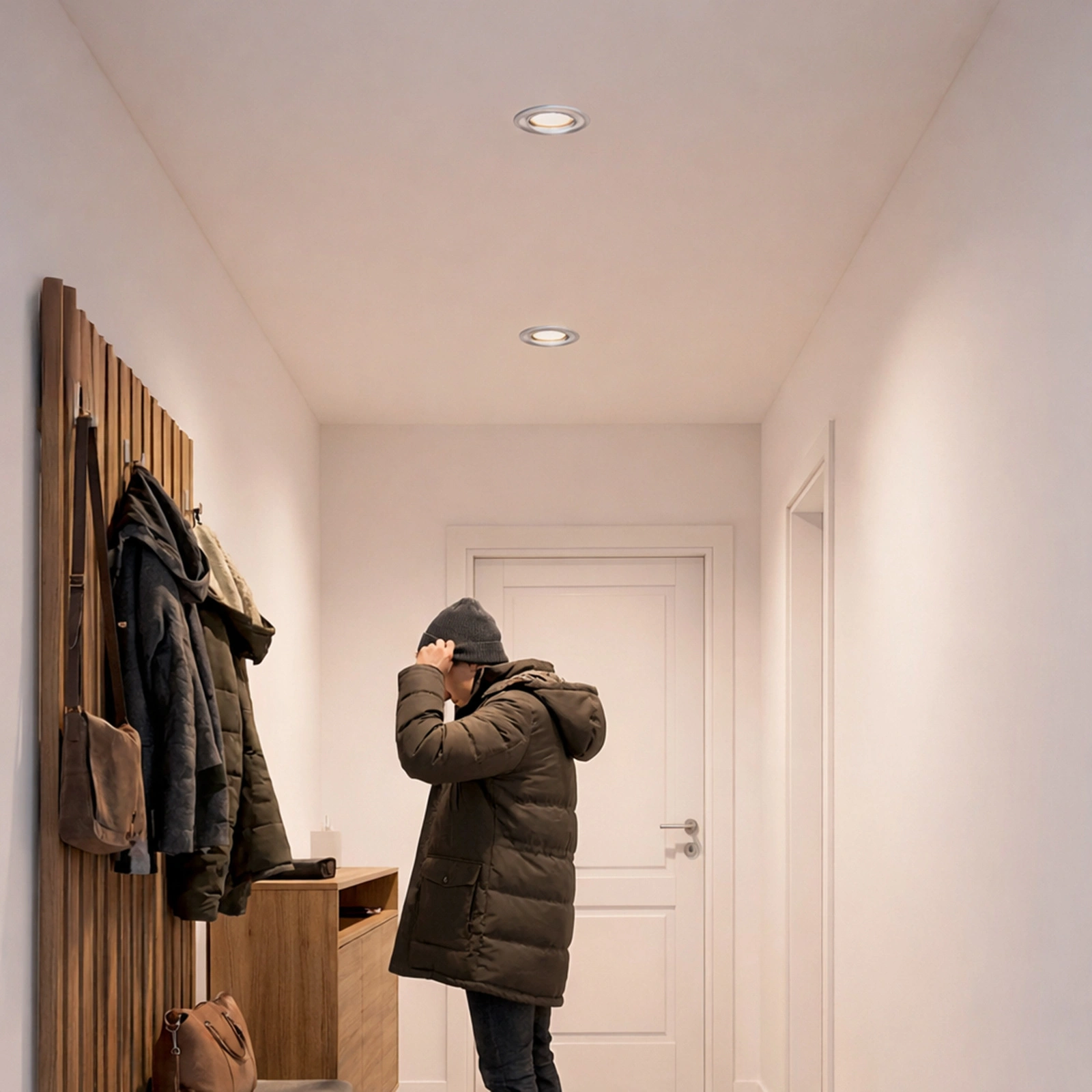Prosta, okrągła forma umożliwia zachowanie czystej przestrzeni, co wprowadza nowoczesność i elegancję. Satynowy pierścień subtelnie akcentuje punkt świetlny, nadając pomieszczeniu elegancki porządek. Dzięki temu wnętrze zyskuje lekkość i wygląda jaśniej, zachowując spójny charakter, niezależnie od stylu wykończenia.