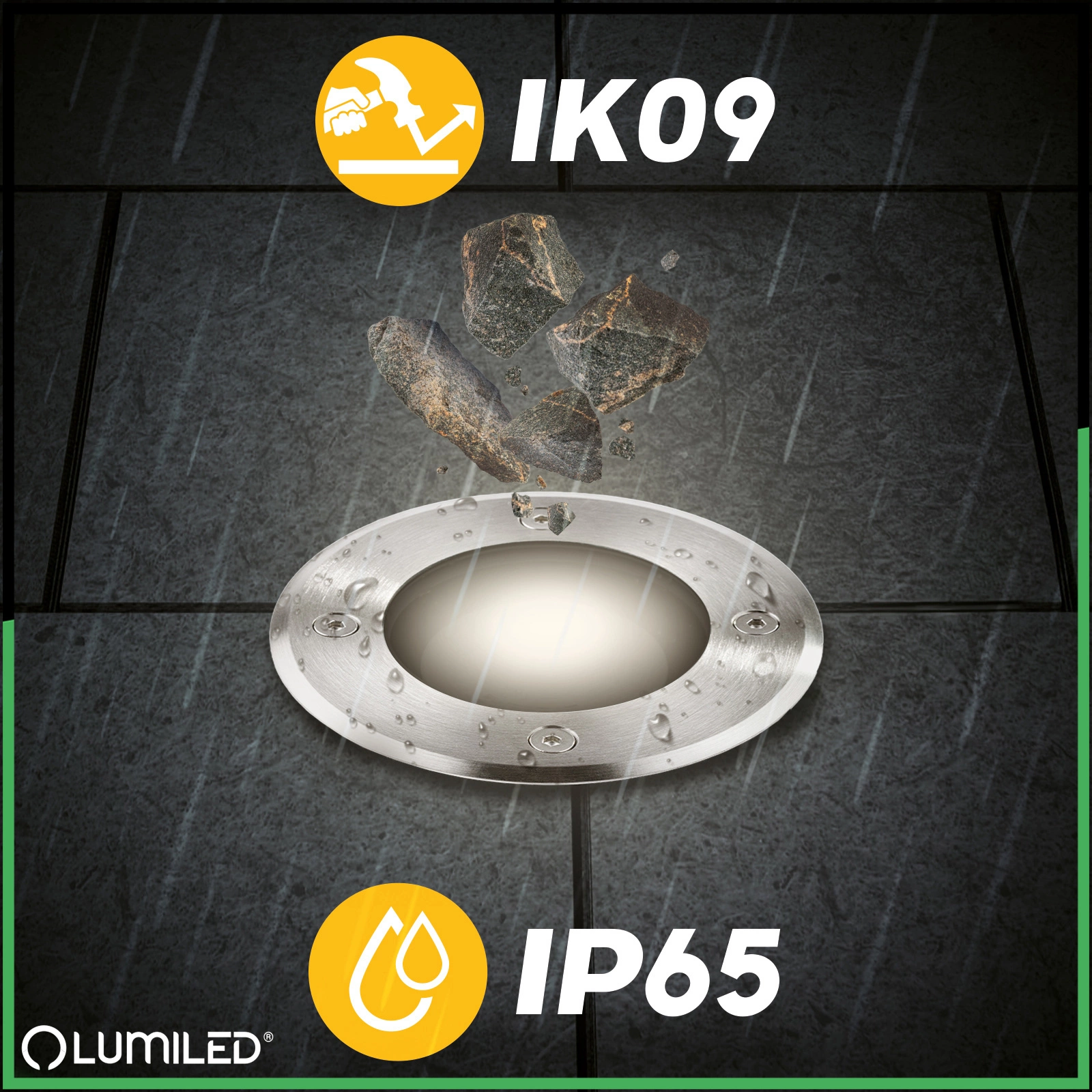 Stal nierdzewna, z której wykonano pierścień oprawy, zapewnia odporność na korozję i warunki atmosferyczne. Klasa IK09 chroni oprawę przed uszkodzeniem mechanicznym, co jest szczególnie istotne w przypadku miejsc narażonych na intensywny ruch. Dodatkowo szczelność IP65 zabezpiecza wnętrze przed wodą, kurzem i błotem, dzięki czemu oprawa działa niezawodnie przez cały rok – niezależnie od pogody. To rozwiązanie, które sprawdzi się zarówno na tarasie, jak i na podjeździe samochodowym.