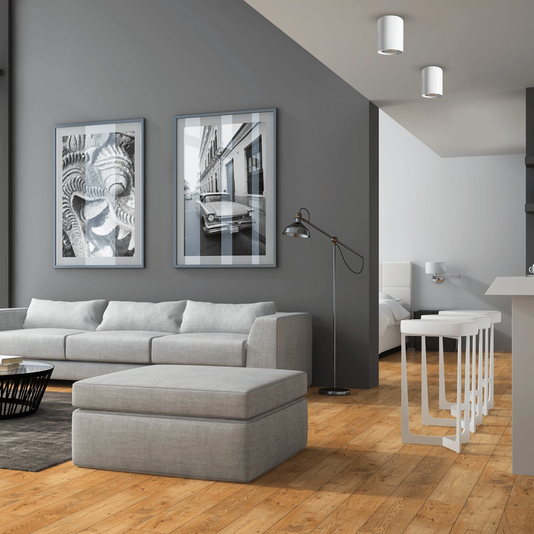 Niewielkie rozmiary wszystkich opraw umożliwiają ich dowolne ułożenie na suficie, w zależności od indywidualnych potrzeb i rozkładu pomieszczenia. Zwłaszcza w kuchni kluczową rolę odegra ich równomierne rozmieszczenie, które pozwoli na wyeliminowanie niekorzystnego efektu cieni. Oprawy natynkowe BIMAwykonano z wysokiej jakości aluminium