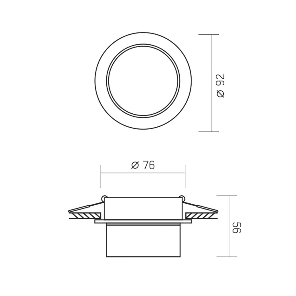 Lampa obsługuje żarówki ze standardowym gwintem GU10, co ułatwia wymianę źródła światła według potrzeb. Przystosowana jest do pracy z napięciem 220-240 V i częstotliwością 50-60 Hz. Zakres temperatury pracy wynosi od -25°C do +50°C, co czyni ją odpowiednią do instalacji w różnych warunkach środowiskowych. Średnica otworu montażowego to 76 mm, co zapewnia zgodność z wieloma standardami.
