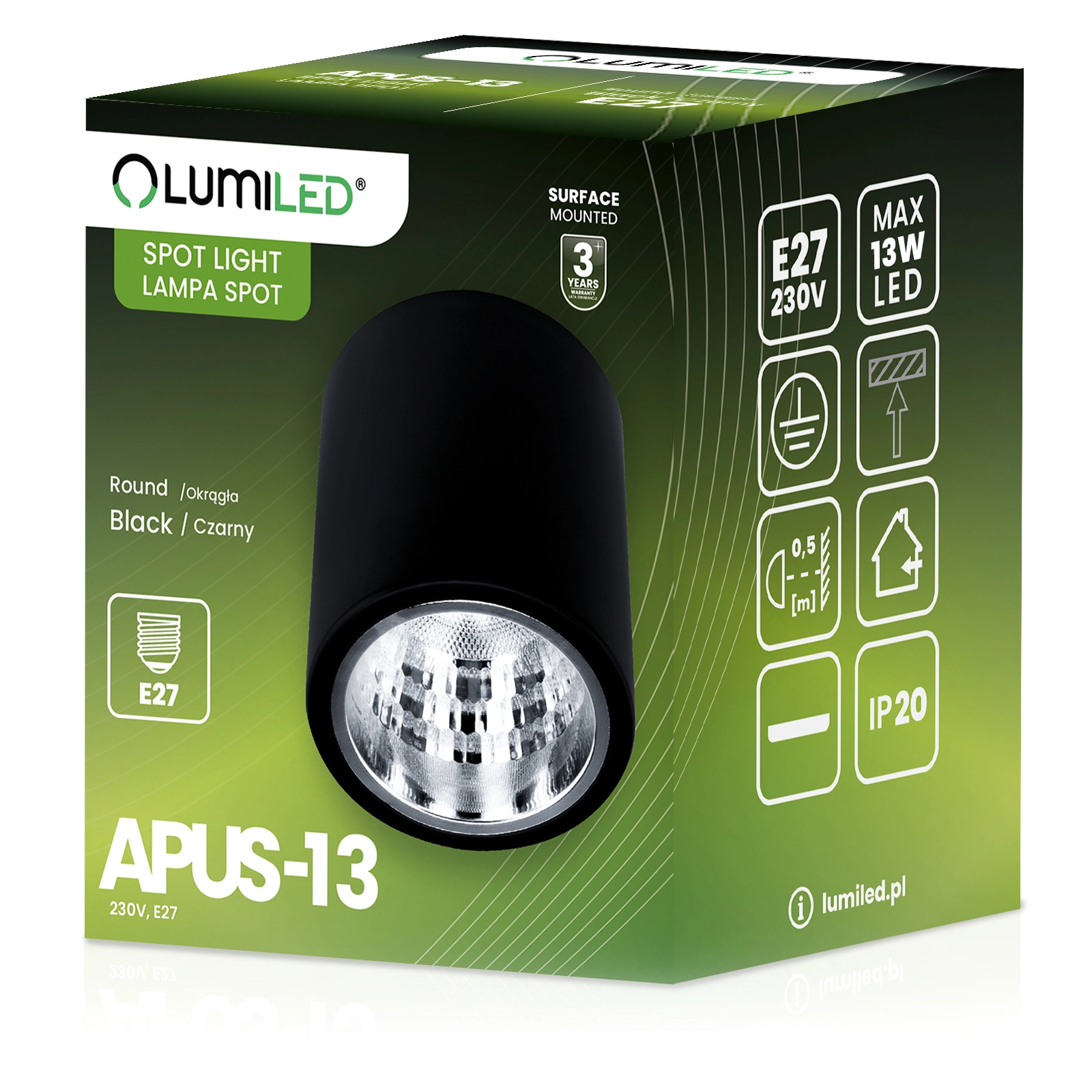 Oprawa natynkowa z serii APUS renomowanej i uznanej w branży oświetleniowej marki Lumiled z trzonkiem E27. Oprawa doskonale sprawdzi się w każdym gospodarstwie domowym, sklepie, hotelu czy restauracji jako oświetlenie akcentowe lub dekoracyjne.