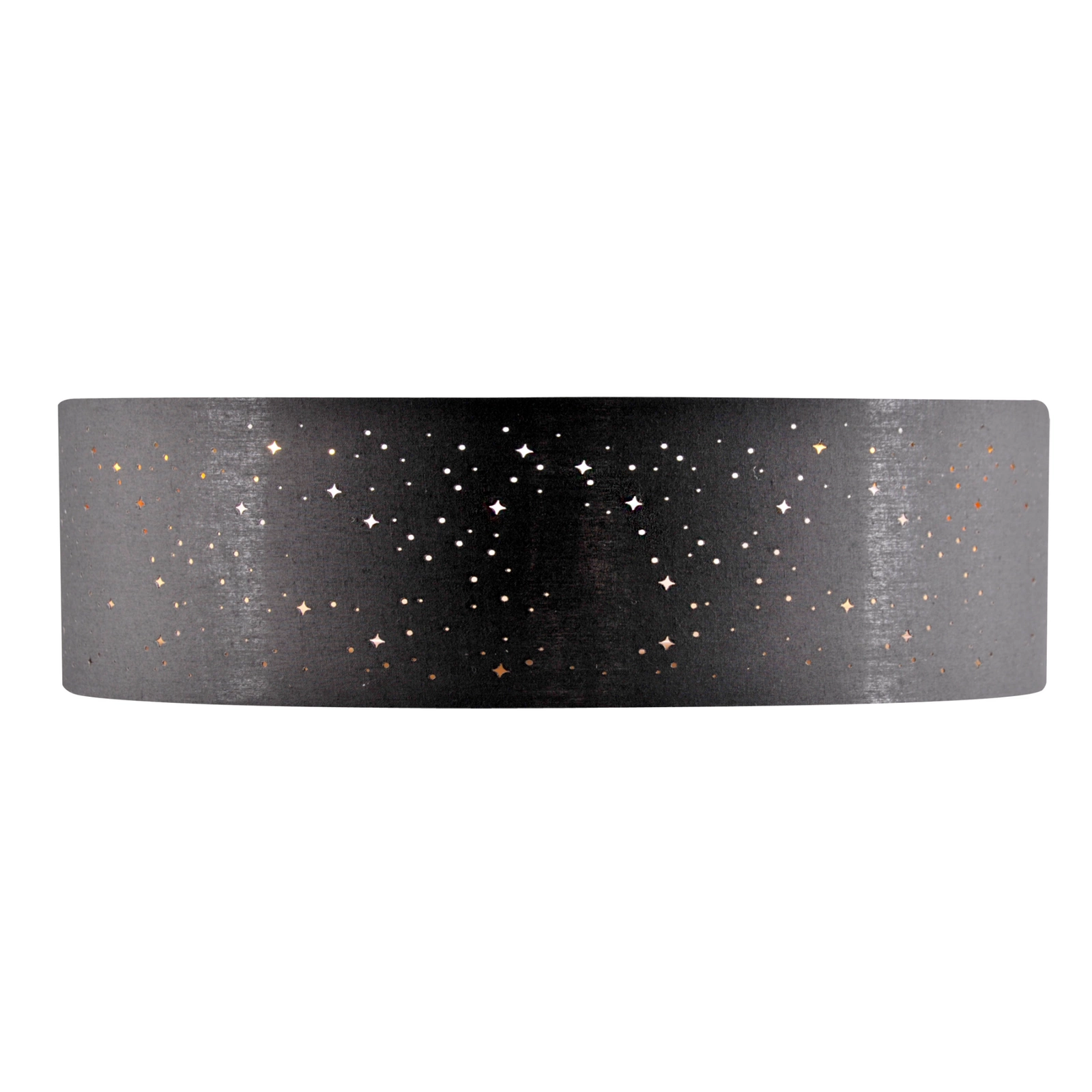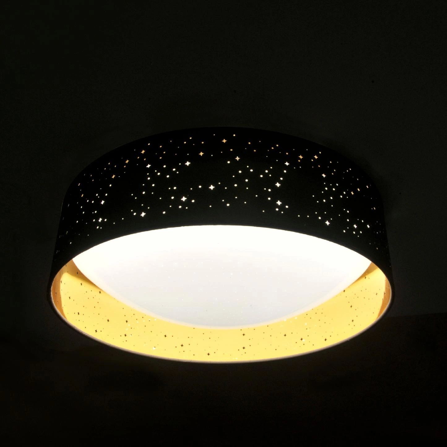 Oprawa sufitowa model Moon to nowoczesny plafon LED wykonany z wysokiej jakości materiałów, który charakteryzuje się nowoczesnym i modnym wyglądem. Czarna zewnętrzna obudowa kontrastuje ze złocistym, lśniącym wnętrzem. Dodatkowym efektem wizualnym są otwory w abażurze, które przypominają malutkie gwiazdy. W oprawie zastosowano wysokowydajne energooszczędne źródła światła LED o łącznej mocy 24W i neutralnej barwie światła (4000K). Diody LED zostały ukryte pod mlecznym perforowanym kloszem, który rzuca łagodne refleksy i zapewnia równomiernie rozpraszające się światło, dzięki czemu niweluje negatywny efekt olśnienia. Nie występuje efekt świecenia punktowego, czy zaciemnionego miejsca z jednej strony (jak w przypadku tradycyjnych plafonów z wkręcaną żarówką). Lampa po włączeniu daje wrażenie gwieździstego nieba. Solidna i sprawdzona konstrukcja sprawia, że prezentowany plafon idealnie sprawdzi się nie tylko w domach i mieszkaniach, ale również jest doskonałą propozycją dla hoteli i innych lokali użytkowych itp. Dodatkowo tą lekką oprawę z tworzywa sztucznego można zamontować na prawie każdej powierzchni.