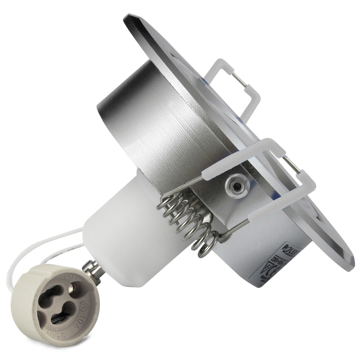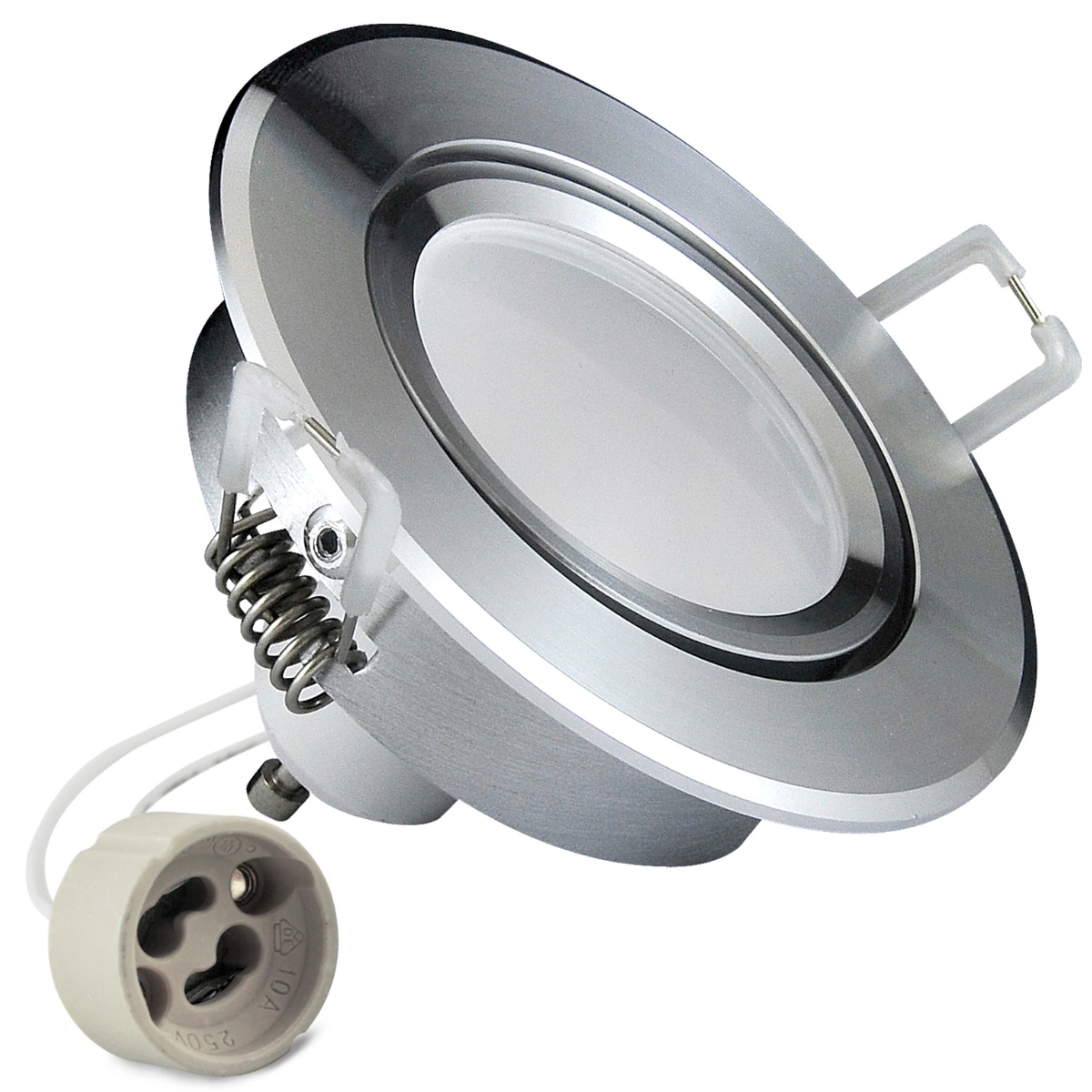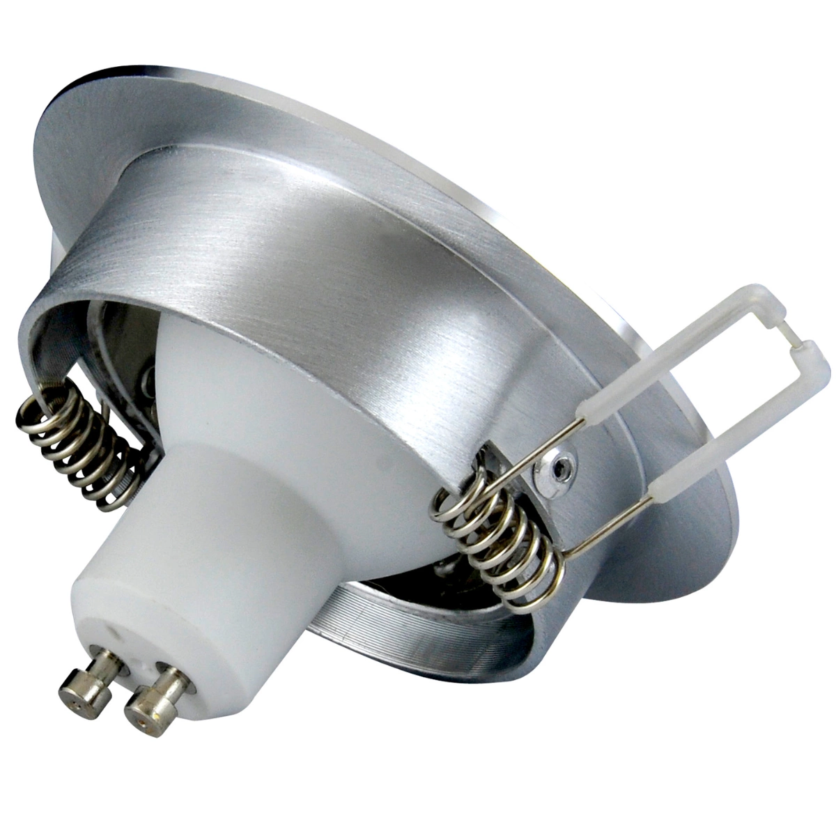 Oprawa podtynkowa firmy Goldlux wraz z żarówką LED GU10 i gniazdem przyłączeniowym GU10 to kompletny zestaw, gotowy do podłączenia w Twoim domu. Ruchoma oprawa sufitowa z serii SUN OLAL wykonana jest z najlepszej jakości aluminium i dostępna jest w srebrnym połyskującym kolorze. Źródło światła dołączone do zestawu świeci przyjemnym, ciepłym białym światłem o mocy 3,5W i strumieniu świetlnym 250lm.