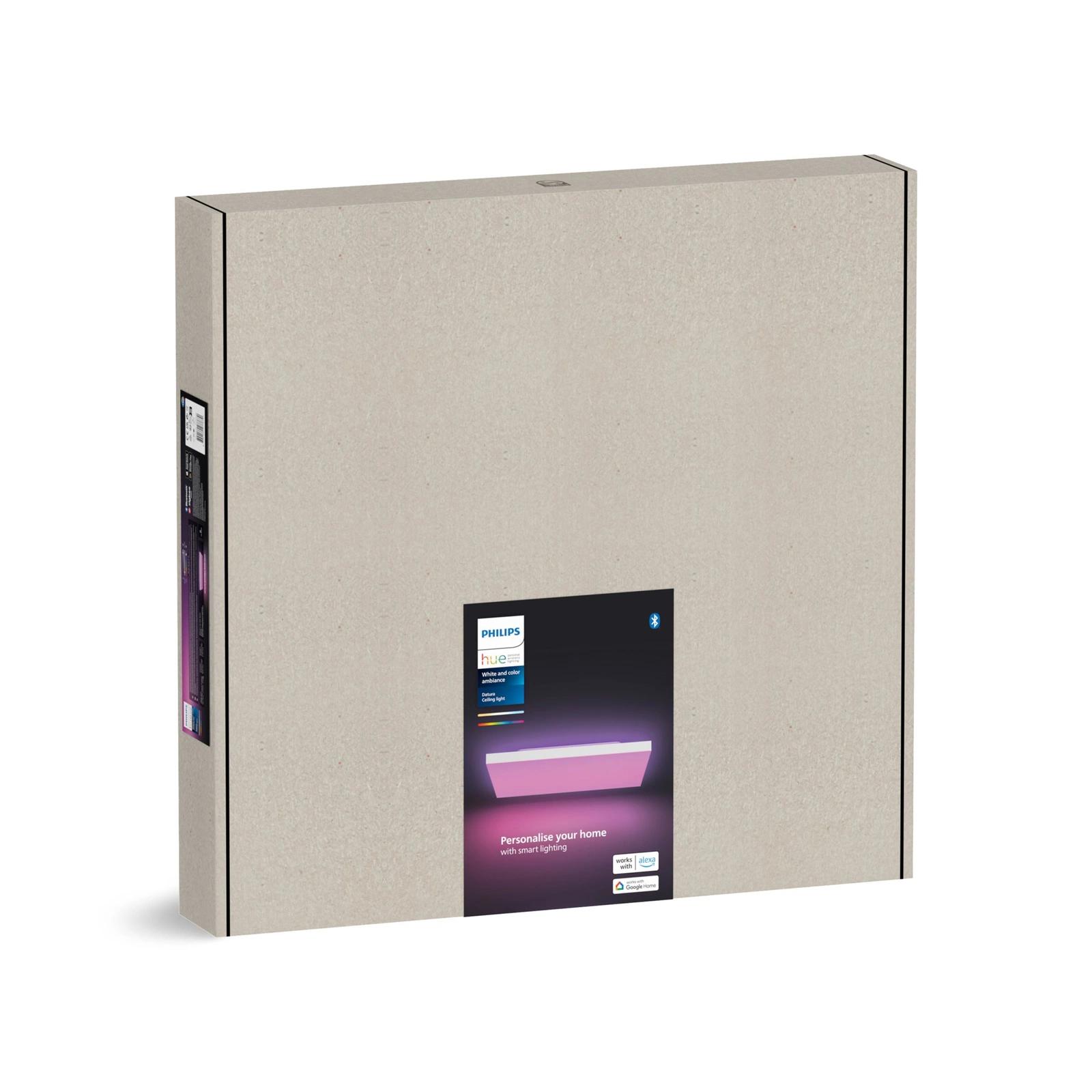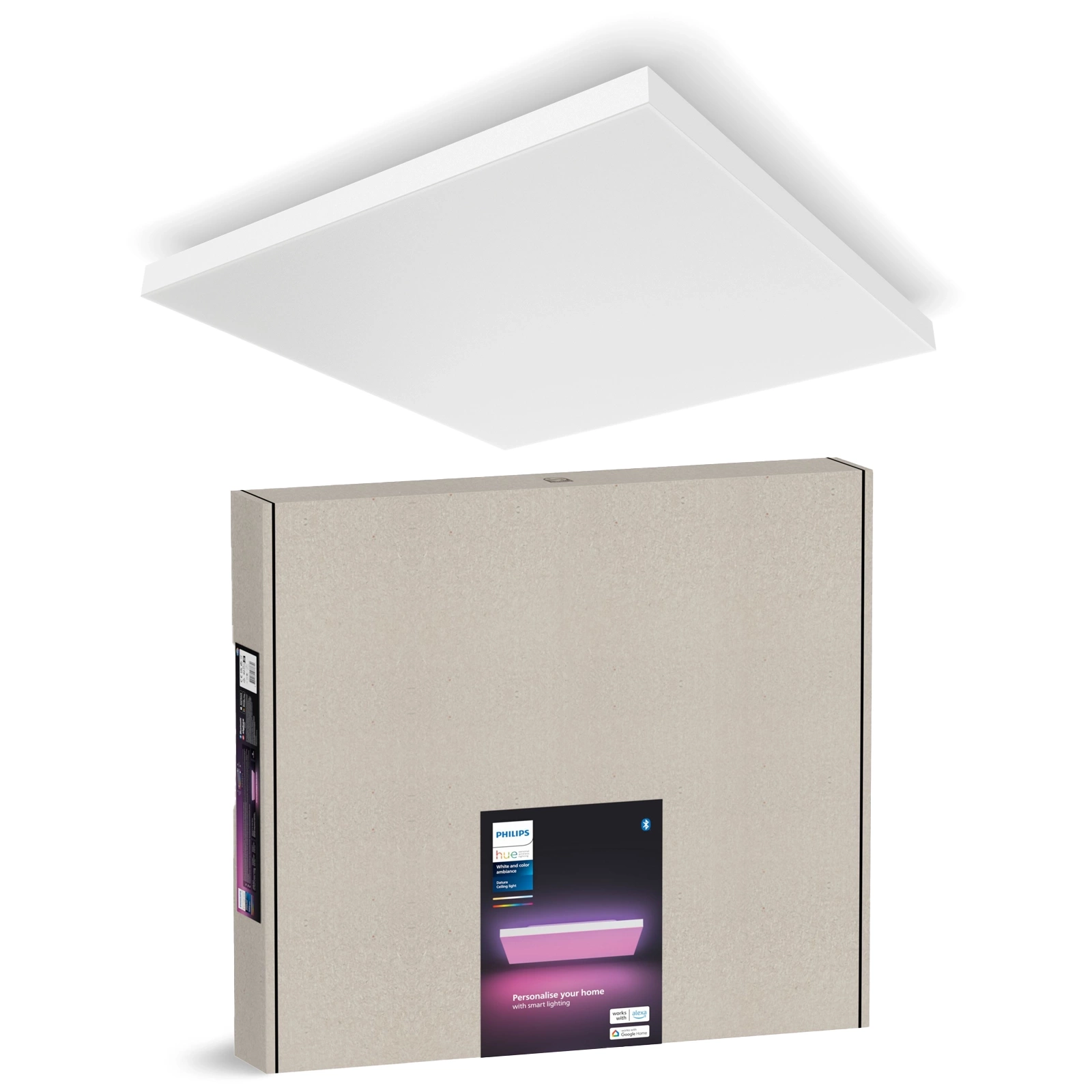 Montaż jest prosty – wystarczy zamocować panel na uchwycie, a następnie zatrzasnąć go w miejscu. Lampa działa z Bluetooth i mostkiem Hue Bridge, co umożliwia sterowanie przez aplikację, głos lub akcesoria smart. Bezramowa konstrukcja w eleganckim białym kolorze oraz metalowo-syntetyczny profil sprawiają, że Datura wpisze się w każdy styl wnętrza.