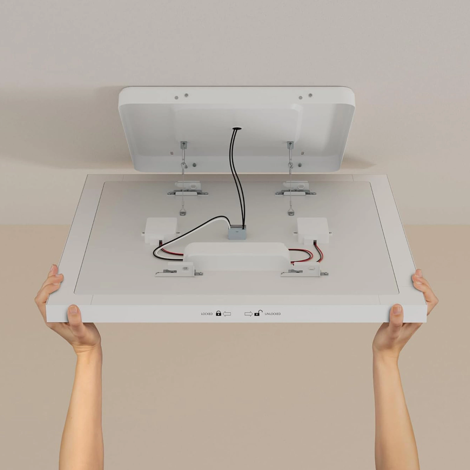 - Nowoczesny design bez ramki: panel idealnie wtapia się w sufit, dodając wnętrzu elegancji i minimalistycznego charakteru.