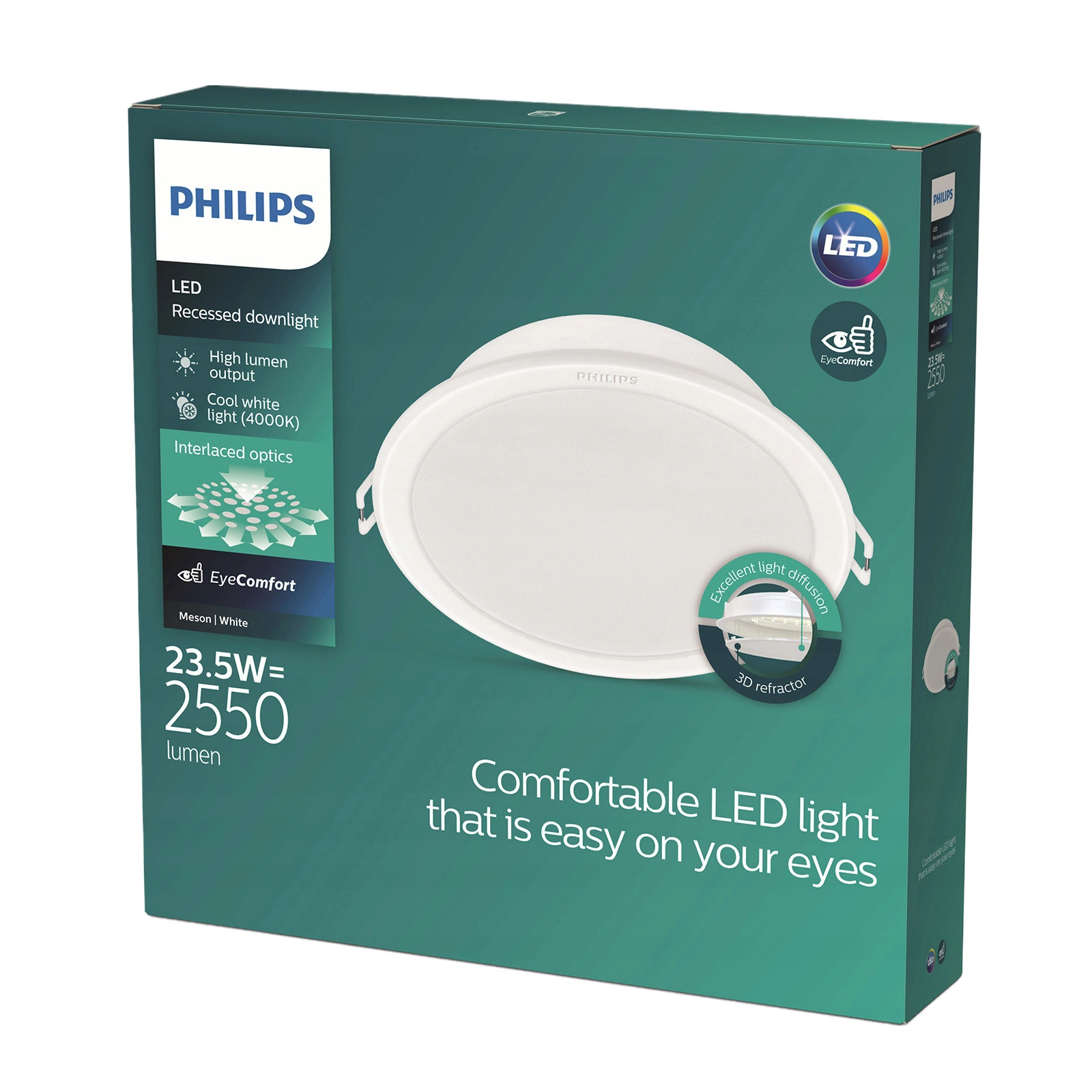 Philips Meson to elegancka, wpuszczana oprawa oświetleniowa LED, która łączy nowoczesny design z wyjątkową funkcjonalnością. Z mocą 23,5 W i średnicą 215 mm, ta kompaktowa oprawa doskonale sprawdzi się w różnych pomieszczeniach, od salonu po kuchnię czy korytarz. Dzięki neutralnemu, białemu wykończeniu, Meson harmonijnie wtapia się w sufit, nie dominując nad wystrojem wnętrza.
