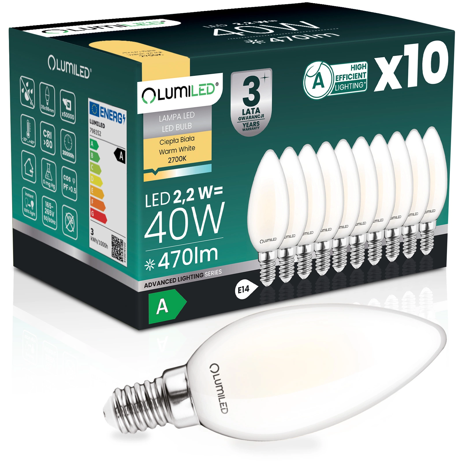 10x Żarówka LED E14 Świeczka B35 2,2W 470lm = 40W 2700K Ciepła 360° Filament KLASA A LUMILED