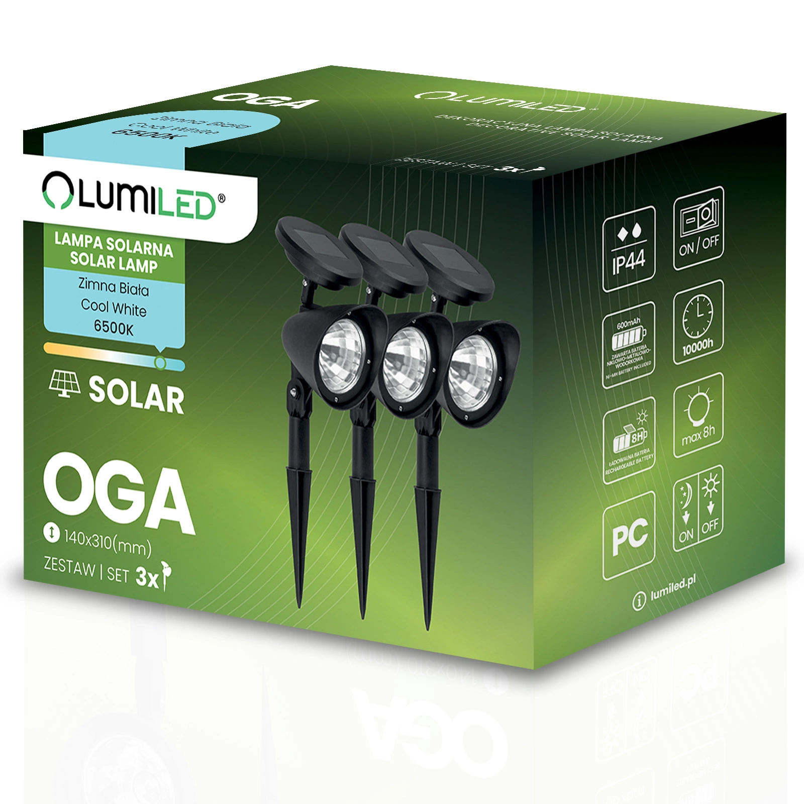 3x Lampa Ogrodowa LED Solarna Wbijana Czarna Kierunkowa OGA Reflektor IP44 6500K LUMILED