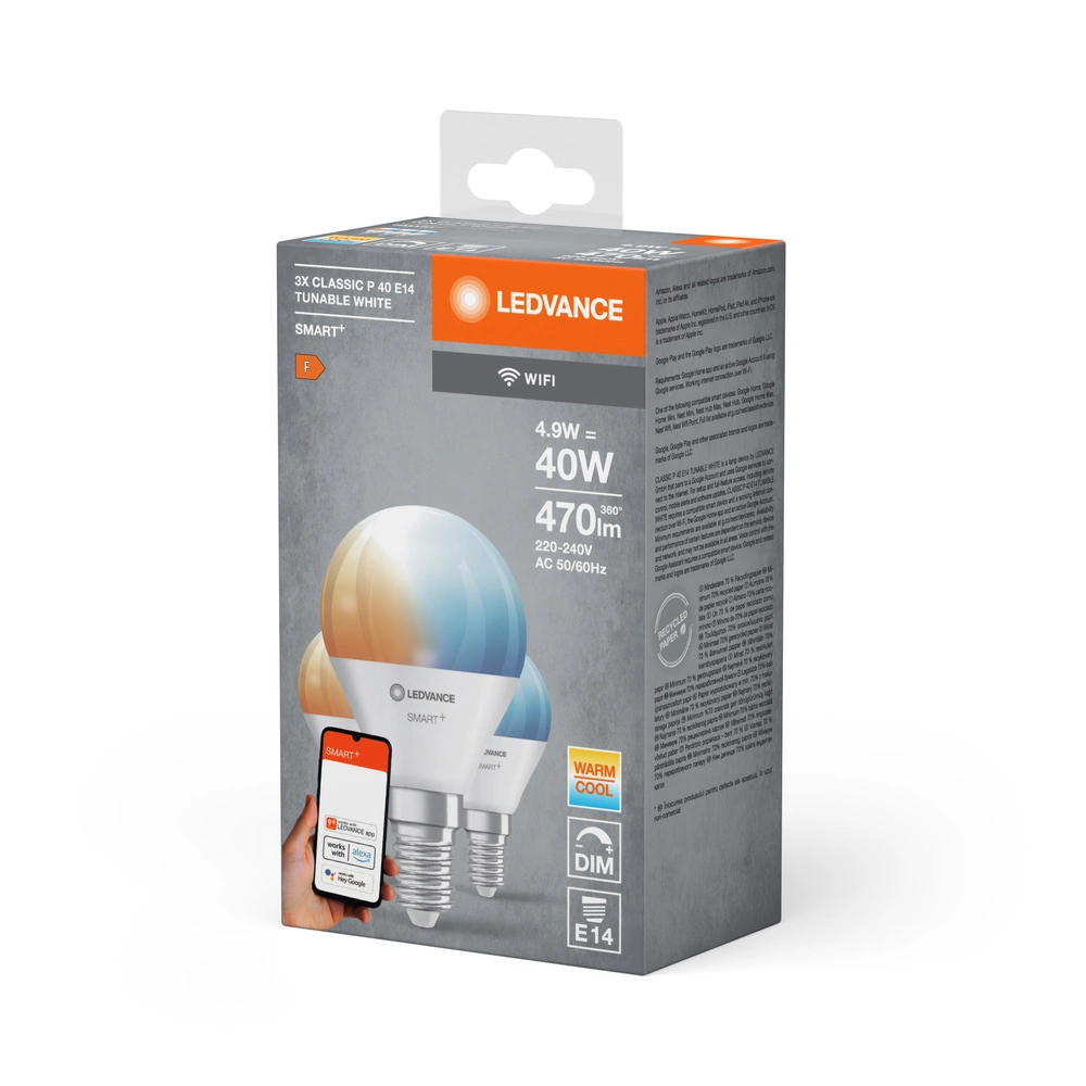 Wprowadź nowoczesne oświetlenie do swojego domu dzięki inteligentnym żarówkom LED marki Ledvance. Model Mini Bulb E14 o mocy 4.9W zapewnia strumień świetlny 470 lm i odpowiada tradycyjnej żarówce o mocy 40W. Dzięki ściemnianiu i technologii WiFi, możesz dostosować temperaturę barwową światła w zakresie CCT, co pozwala stworzyć idealną atmosferę we wnętrzu.