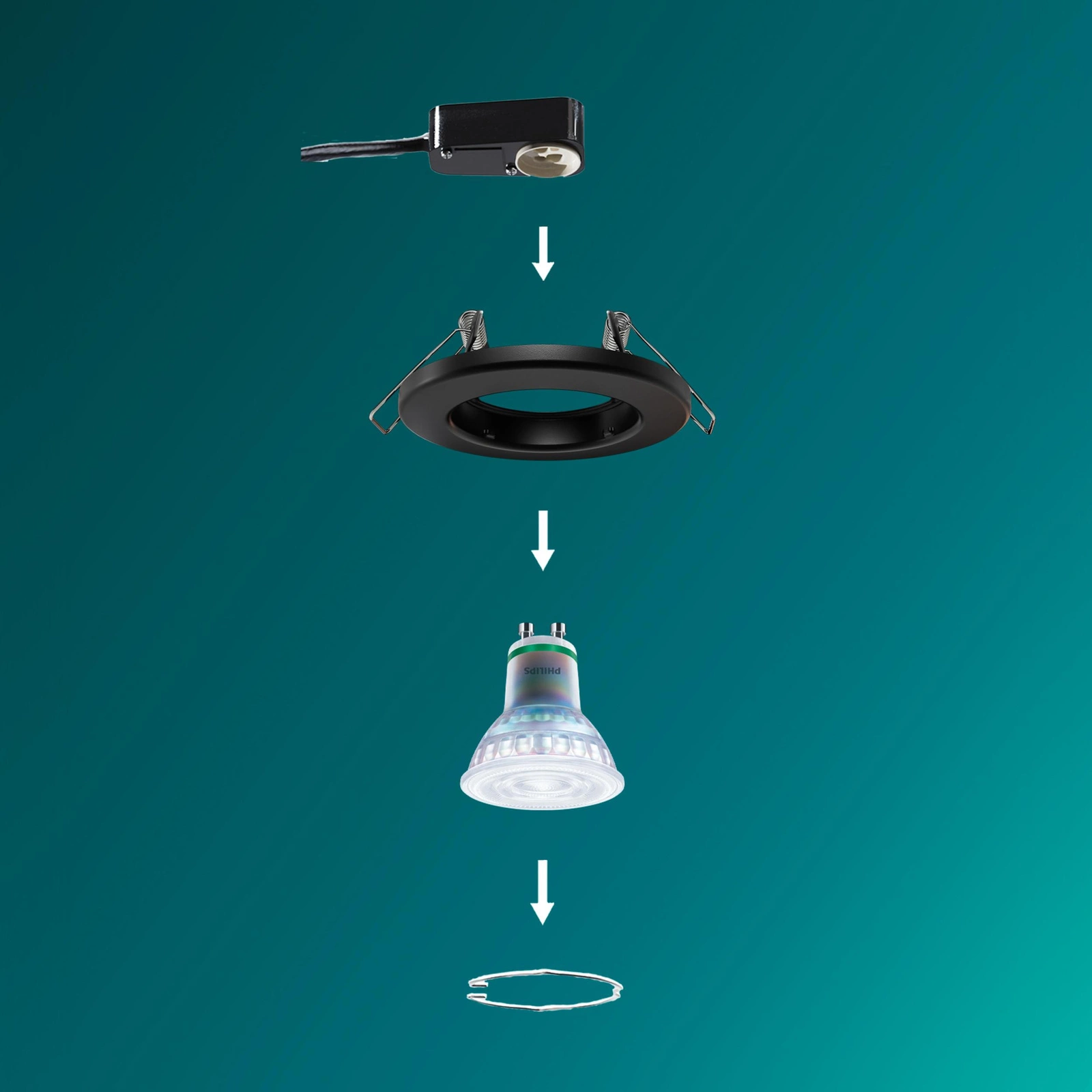 Oświetlenie, które odmieni Twoje wnętrza! Zestaw pięciu nowoczesnych opraw podtynkowych Peridot firmy Philips, które idealnie podkreślą styl każdego pomieszczenia. Wykonane z najwyższej jakości, trwałego aluminium, w eleganckim czarnym, matowym wykończeniu, stanowią doskonały wybór dla tych, którzy cenią sobie zarówno estetykę, jak i funkcjonalność. Dzięki klasycznemu okrągłemu kształtowi i możliwości wpuszczenia w sufit, oprawy te wkomponują się w każdą przestrzeń, od nowoczesnej kuchni po stylowy salon.