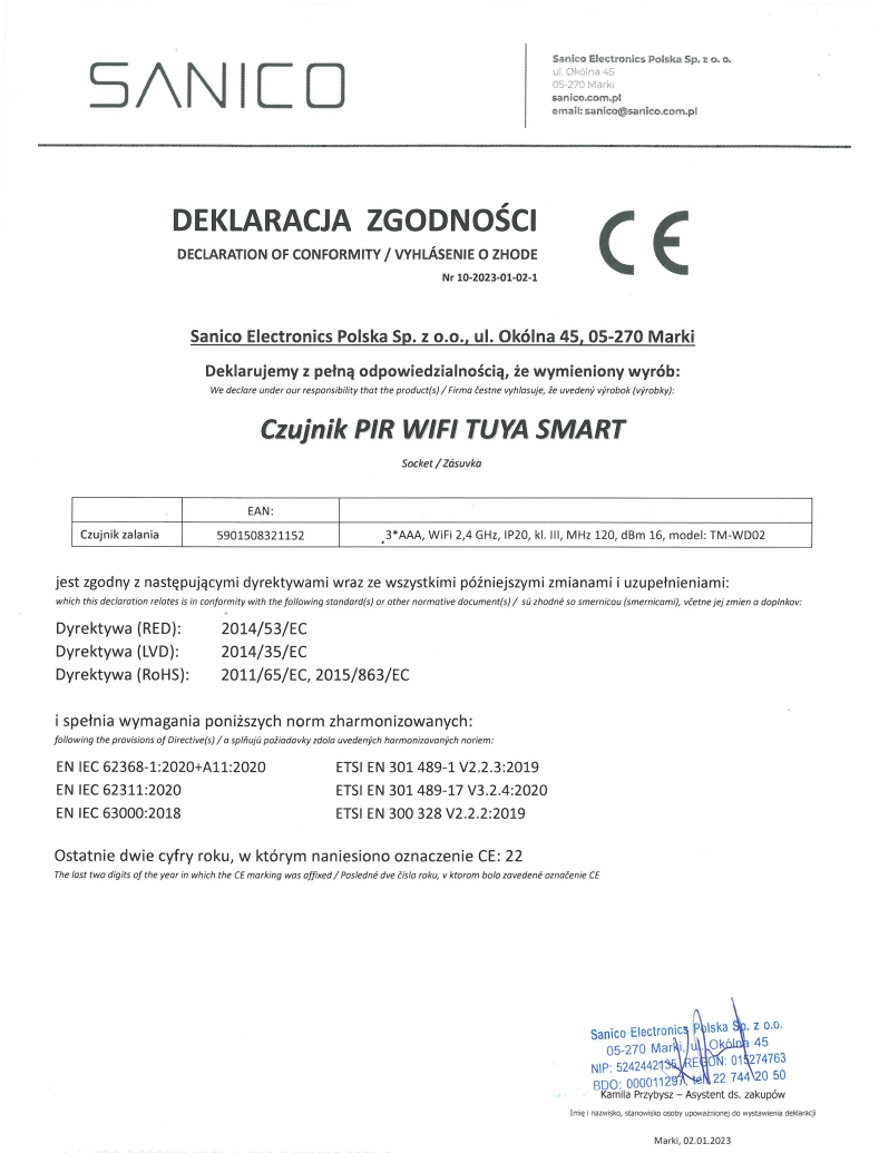 - Bezpieczeństwo i zgodność – Produkt posiada certyfikat CE i jest zgodny z dyrektywą 2014/53/WE.