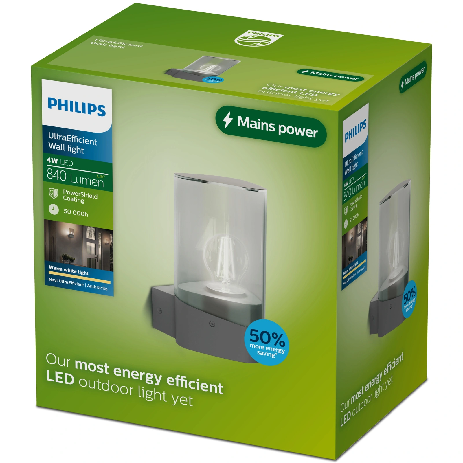 - Wyjątkowa energooszczędność: Zewnętrzny kinkiet Philips Nayl wyposażony w ultra wydajną żarówkę LED zużywa o 50% mniej energii w porównaniu do standardowych rozwiązań.