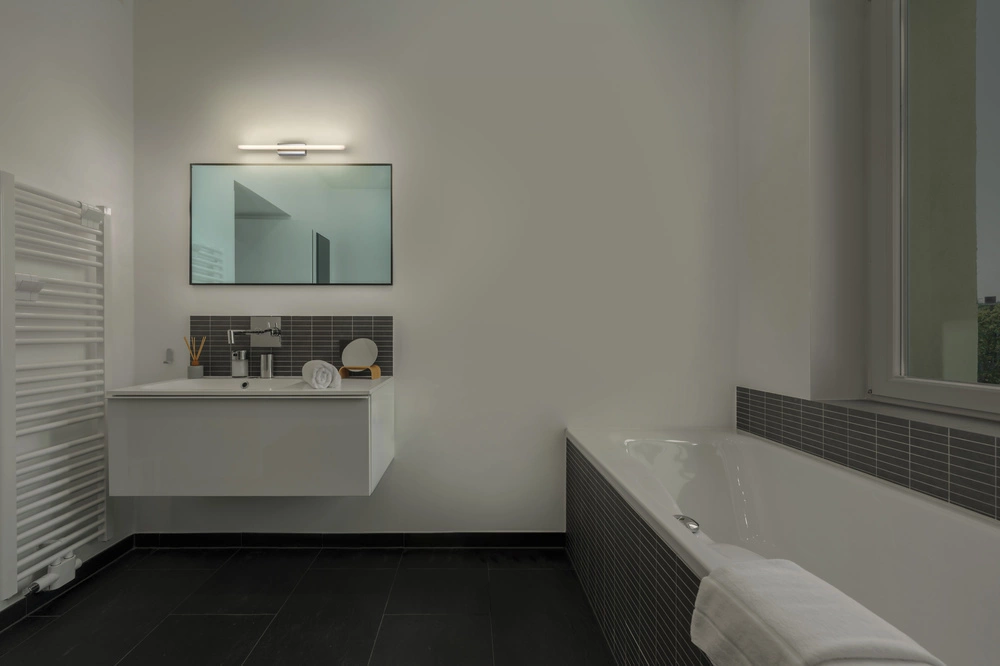 Lampa charakteryzuje się wysoką jakością wykonania z tworzywa sztucznego i aluminium oraz wykończeniem w eleganckim kolorze chromu. Zastosowana technologia LED gwarantuje trwałość do 30 000 godzin i sprawność na poziomie 95 lm/W. Dzięki możliwości ściemniania, lampa pozwala stworzyć odpowiednią atmosferę w pomieszczeniu. Wysoki stopień ochrony IP44 zapewnia jej odporność na wilgoć, co czyni ją idealnym wyborem do wnętrz łazienkowych.