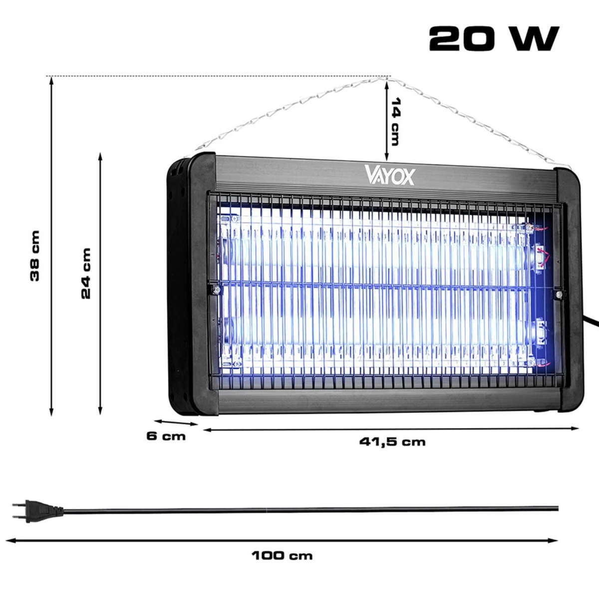 Lampa owadobójcza VAYOX to idealne rozwiązanie do eliminacji much, komarów oraz innych owadów w zasięgu do 100m2. Zasilana sieciowo, urządzenie posiada moc znamionową 20W oraz działa w przedziale napięcia 220-240V. Wykonana z trwałego tworzywa sztucznego i metalu, oferuje elegancki, czarny design, który doskonale wkomponuje się zarówno w otoczenie zewnętrzne, jak i wewnętrzne.