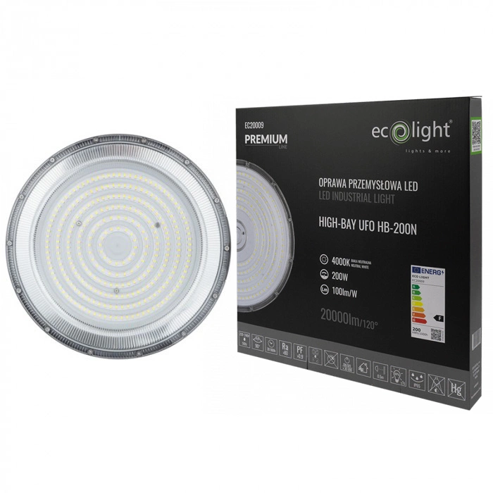 Lampa Przemysłowa Wisząca LED UFO HIGHBAY 200W Ecolight to doskonałe rozwiązanie dla wymagających przestrzeni przemysłowych. Oferuje imponujący strumień świetlny o wartości 20000 lumenów przy mocy 200W, co zapewnia wspaniałą jasność i wydajność oświetleniową. Dostępna z neutralną barwą światła 4000K, idealnie nadaje się do miejsc wymagających zrównoważonego oświetlenia. Jej solidna konstrukcja z aluminium i ABS oraz stopień ochrony IP65 gwarantują odporność na pył i wilgoć, co sprawia, że lampa jest idealna nawet w trudnych warunkach.