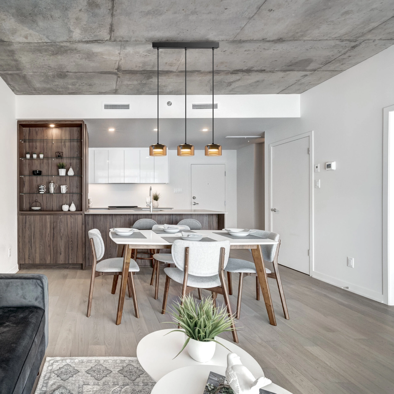 - Jadalnia: Estetyczne oświetlenie nad stołem, podkreślające aranżację wnętrza