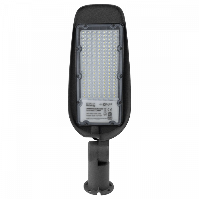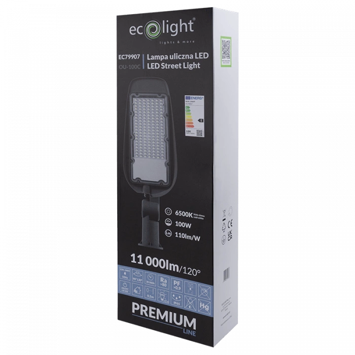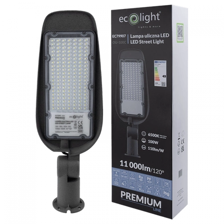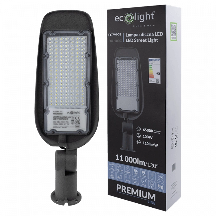 Lampa uliczna drogowa LED 100W marki Ecolight to niezawodne i wydajne rozwiązanie oświetleniowe przeznaczone do użytku zewnętrznego. Wyposażona w diody LED typu SMD, zapewnia intensywne światło o strumieniu świetlnym 11000 lm i skuteczności 110 lm/W. Chłodna biała barwa o temperaturze 6500K gwarantuje wyraźne i przyjemne dla oka oświetlenie, idealne do zastosowań na terenach przemysłowych, ulicach czy parkingach. Dzięki solidnemu wykonaniu z aluminium w kolorze szarym, lampa charakteryzuje się dużą wytrzymałością i eleganckim wyglądem, odporna na trudne warunki atmosferyczne dzięki wysokiemu stopniowi ochrony IP65 oraz wytrzymałości IK08 na uszkodzenia mechaniczne.