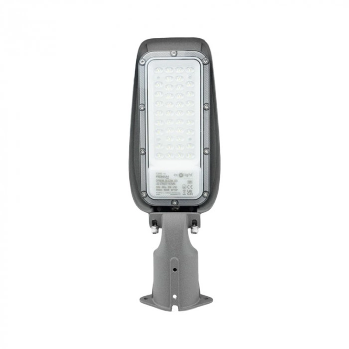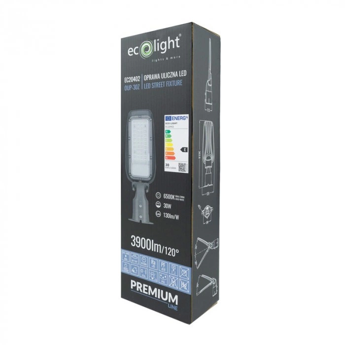 Lampa uliczna drogowa LED 30W to najwyższej jakości rozwiązanie oświetleniowe marki Ecolight, idealne do zewnętrznych zastosowań miejskich i drogowych. Dzięki mocy 30W i imponującej skuteczności świetlnej wynoszącej 130lm/W, lampa dostarcza strumień świetlny o wartości 3900lm, zapewniając jasne i efektywne oświetlenie obszaru docelowego. Dzięki zimnej barwie światła 6500K, doskonale pasuje do przestrzeni wymagających intensywnego oświetlenia. Zintegrowane źródło LED o wysokim wskaźniku oddawania barw Ra 80 gwarantuje długi czas działania i niewielkie zużycie energii.