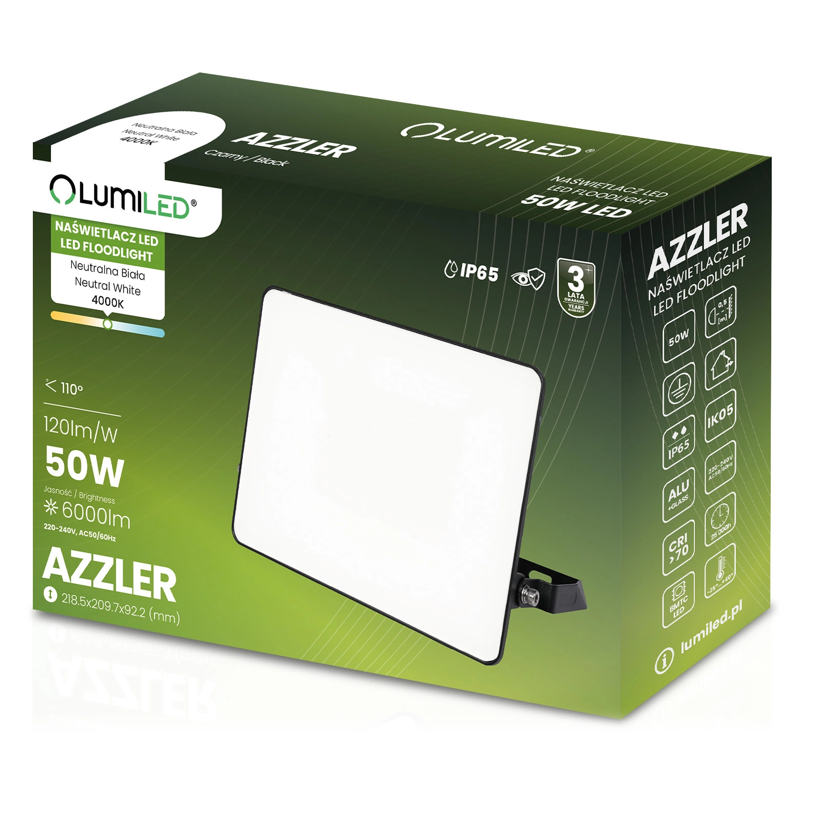 Naświetlacz AZZLER wyposażono w wydajne źródło LED o mocy 50W, które generuje aż 6000 lumenów jasnego, neutralnego światła (4000K). Dzięki temu zapewnia doskonałą widoczność w każdym zakątku posesji – niezależnie od pory dnia czy warunków atmosferycznych. Zastosowanie szerokiego kąta świecenia 110° pozwala oświetlić dużą powierzchnię bez potrzeby stosowania wielu punktów świetlnych. To idealne rozwiązanie dla tych, którzy cenią sobie oszczędność energii, efektywne doświetlenie i nowoczesny design w jednym urządzeniu.