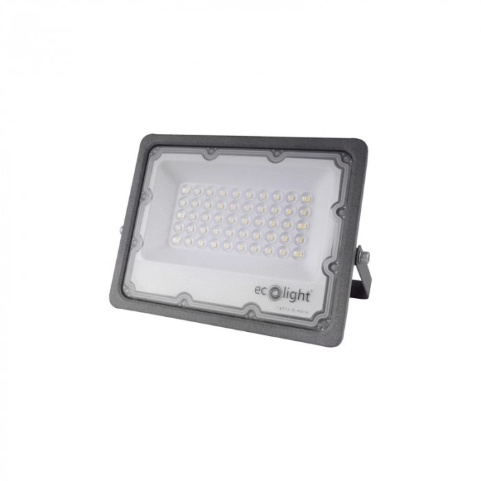 Naświetlacz LED Premium Line Ecolight o mocy 50W to doskonałe rozwiązanie do efektywnego oświetlenia przestrzeni zewnętrznych. Charakteryzujący się wysokim strumieniem świetlnym 5000lm, zapewnia jasne i wyraźne światło o temperaturze barwowej 6500K, co doskonale odwzorowuje zimne, białe światło dzienne. Produkt wyposażony jest w nowoczesne diody SMD, które gwarantują skuteczność świetlną na poziomie 100lm/W. Aluminiowa obudowa zapewnia odpowiednią trwałość i odporność na uszkodzenia mechaniczne, a doskonały stopień ochrony na poziomie IP65 pozwala na skuteczne użycie w różnych warunkach atmosferycznych.