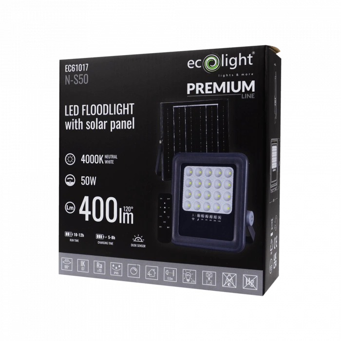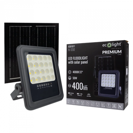 Naświetlacz LED Lampa Reflektor Solarny 50W 900lm 4000K Neutralna IP65 z Czujnikiem Zmierzchu + Pilot Ecolight