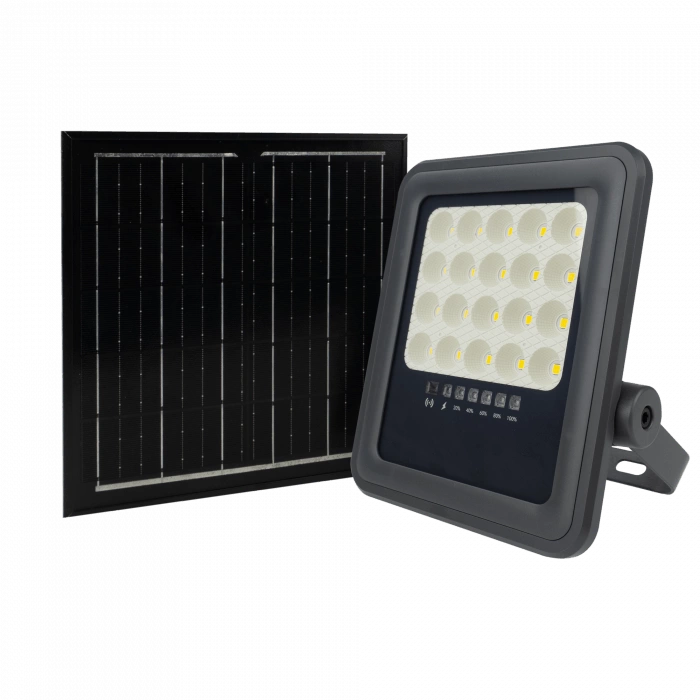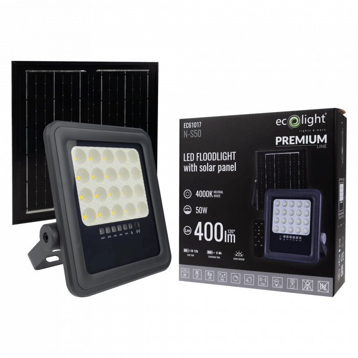 Odkryj energooszczędne rozwiązanie oświetleniowe z Naświetlaczem LED Ecolight o mocy 50W, zasilanym przy pomocy panelu solarnego. Dzięki jasności na poziomie 900 lm, oświetlenie jest intensywne i efektywne, co czyni go idealnym wyborem do miejsc takich jak ogrody, tarasy, czy ścieżki. Naświetlacz emituje światło o temperaturze barwowej 4000K, zapewniając neutralną białą poświatę harmonizującą z naturalnym otoczeniem. Dzięki zintegrowanemu czujnikowi zmierzchu oraz pilotowi, urządzenie oferuje funkcjonalność i wygodę, ułatwiające codzienne użytkowanie.