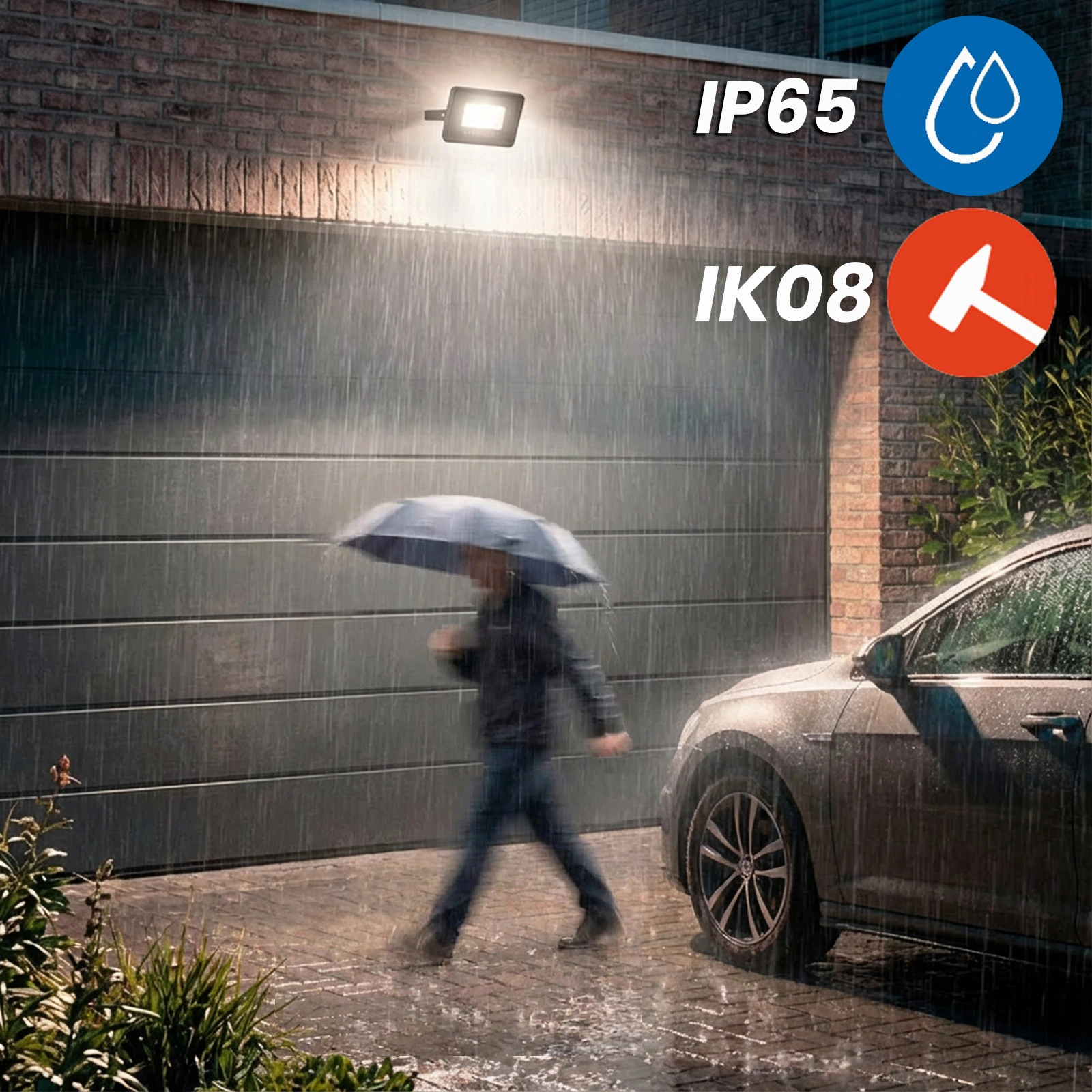 Skuteczność świetlna 90 lm/W pozwala uzyskać więcej użytecznego światła przy tym samym poborze energii niż oferują typowe oprawy dostępne na rynku. Dzięki temu naświetlacz skutecznie doświetla przestrzeń, ograniczając straty mocy i realnie zmniejszając koszty eksploatacji. To przewaga widoczna w codziennym użytkowaniu – jasne, równomierne światło bez konieczności sięgania po mocniejsze i droższe w utrzymaniu oprawy.