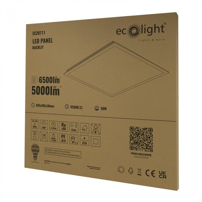 - Wysoka wydajność świetlna: Strumień świetlny 6500 lm oraz moc 50W zapewniają optymalne oświetlenie, idealne do biur i korytarzy.