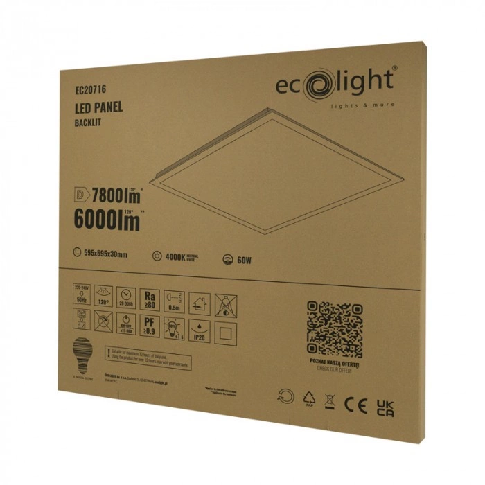 - Wysoka efektywność świetlna: Dzięki mocy 60W i strumieniowi świetlnemu 7800 lm, panel zapewnia doskonałe oświetlenie dużych przestrzeni.