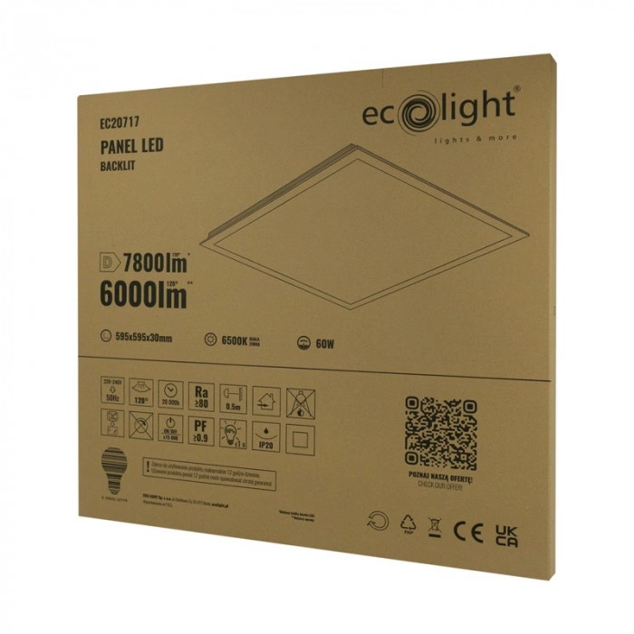 Panel jest nie tylko estetyczny, ale także wysoce efektywny, z mocą znamionową 60W oraz współczynnikiem mocy λ 0.9. Wykonany z trwałego polichlorku winylu (PVC), zapewnia długowieczność na poziomie 20 000 godzin użytkowania. Kąt rozsyłu światła 120° pozwala na równomierne oświetlenie dużych przestrzeni. Niech ten panel LED stanie się nieodłącznym elementem każdego nowoczesnego wnętrza!