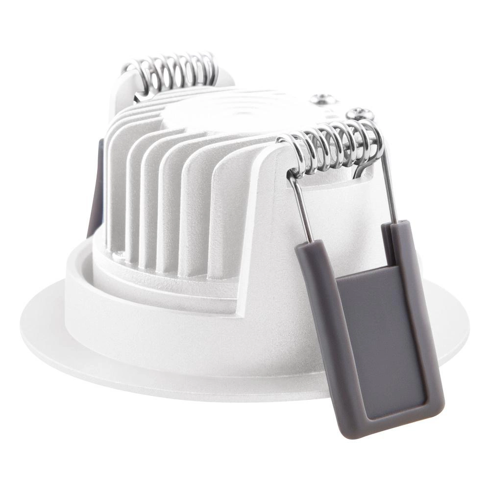 Oprawa wykonana jest z aluminium i dostępna w kolorze białym, co podkreśla jej nowoczesny design. Produkt można zintegrować w instalacjach dzięki sposobowi montażu wpuszczanego o średnicy montażowej 68mm. Ściemnialna funkcja KMX umożliwia regulację jasności według potrzeb. Z trwałością 50000 godzin i możliwością pracy w temperaturach od -20°C do +40°C, oprawa LED spełnia wszystkie wymagania nowoczesnego oświetlenia. Oprawa posiada również certyfikat CE oraz wysokie wskaźniki bezpieczeństwa IP20 i IK03.