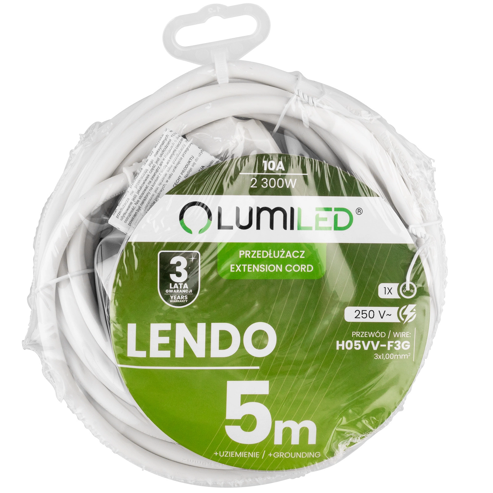 Przedłużacz Sieciowy Kabel z Uziemieniem Listwa Zasilająca 1 Gniazdo 5m Biały Sznur Lendo Lumiled