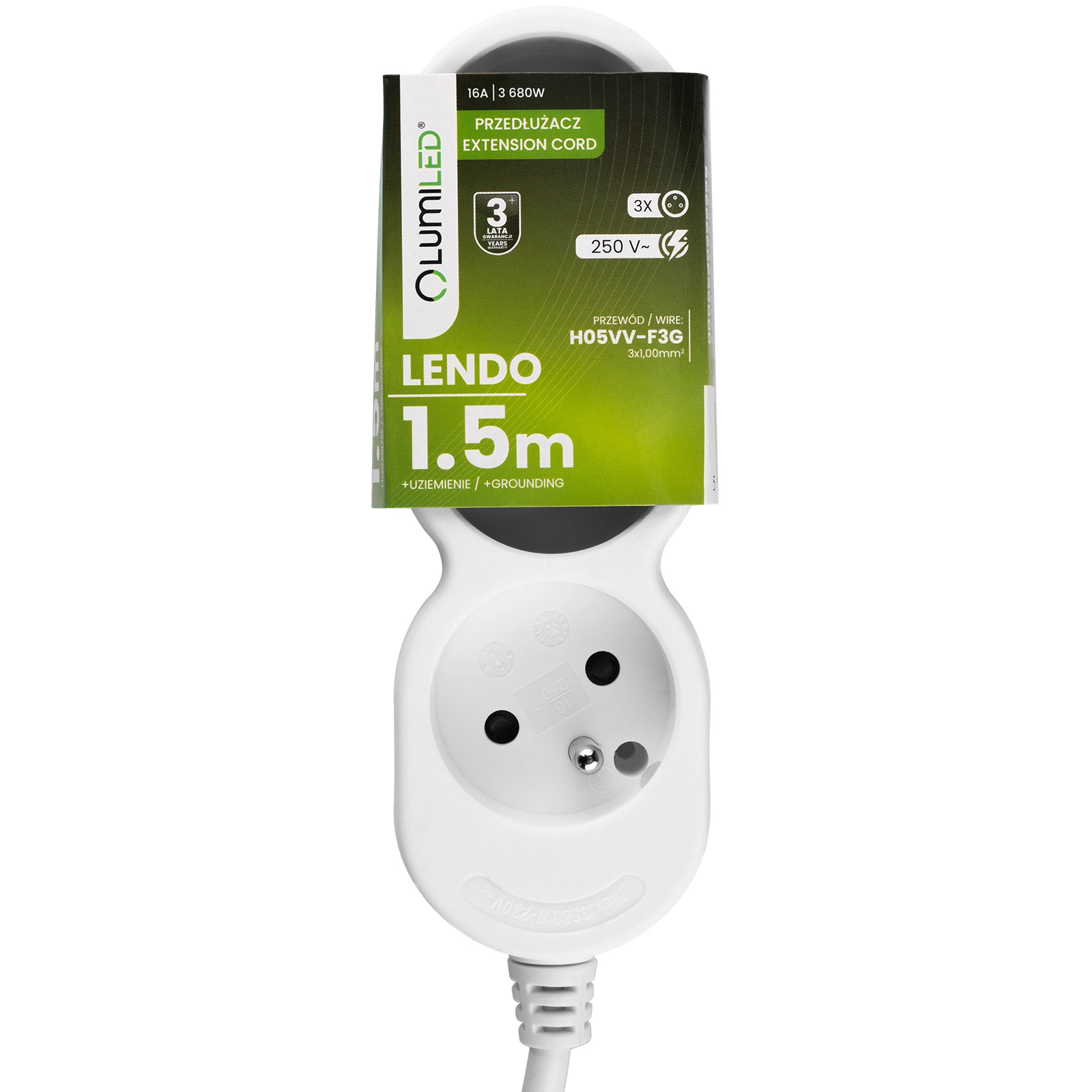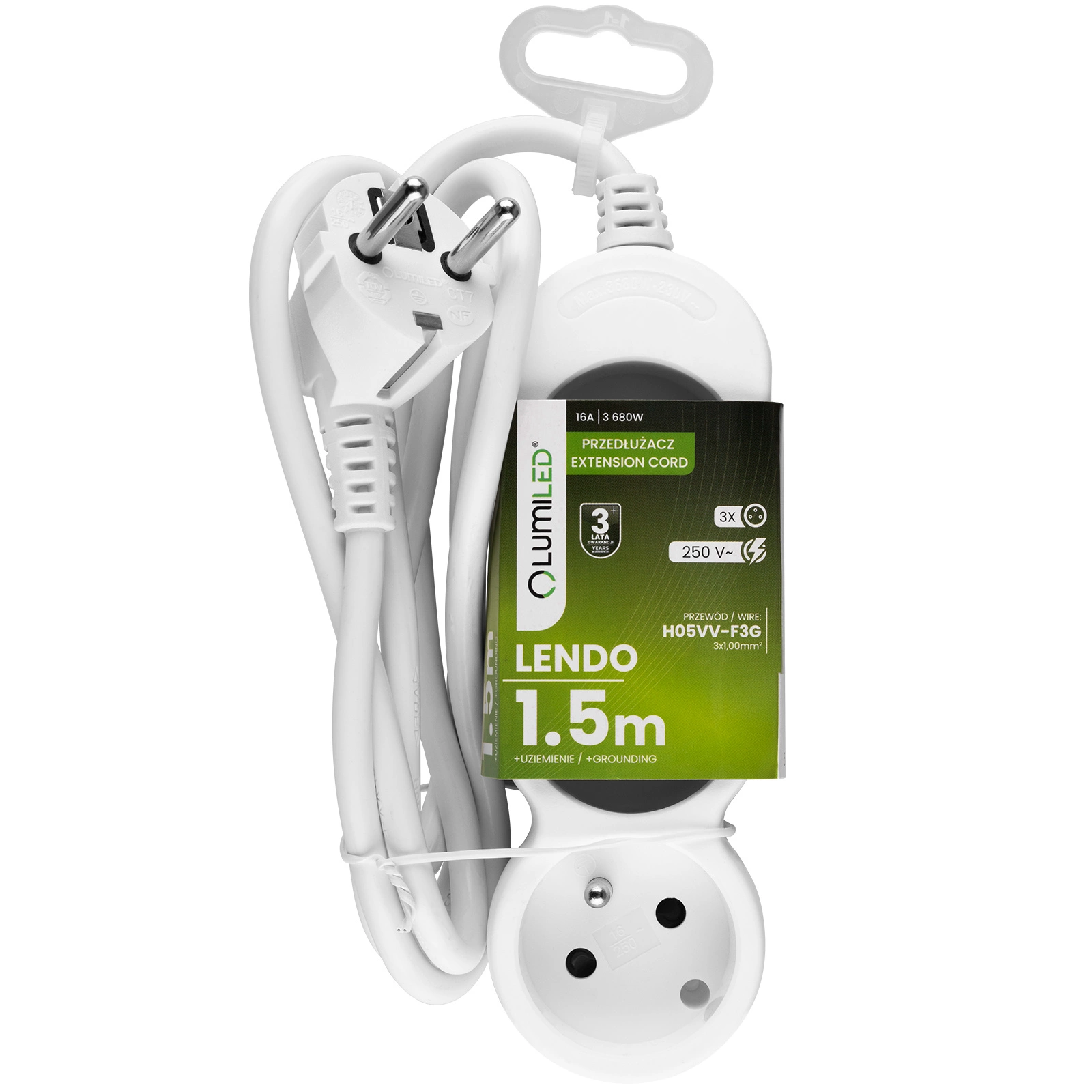 Przedłużacz Sieciowy Kabel z Uziemieniem Listwa Zasilająca 3 Gniazda 1.5m Biały Sznur Lendo Lumiled