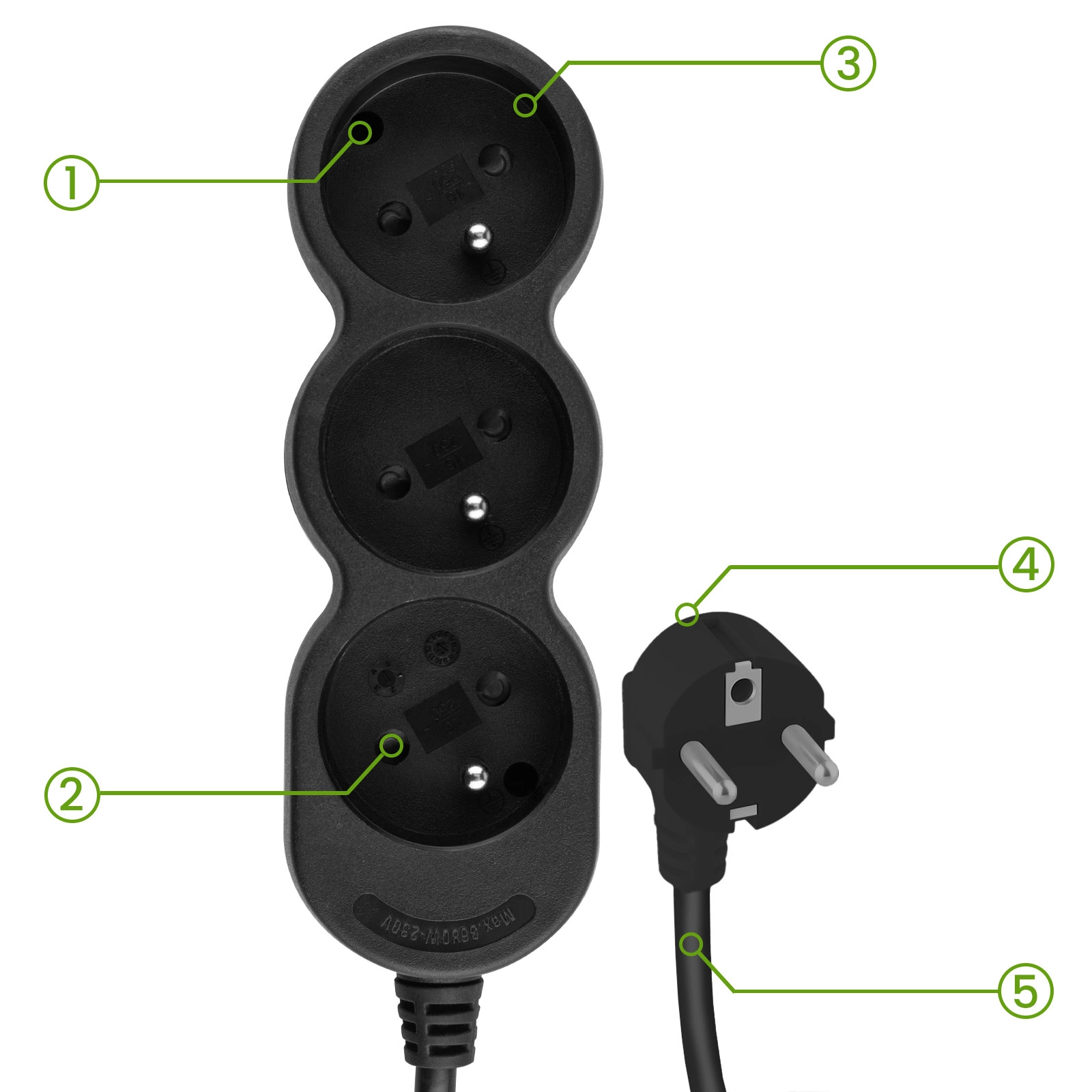 - 3 gniazda z uziemieniem chroni użytkownika i podłączone urządzenia przed skutkami przepięć oraz przeciążeń.