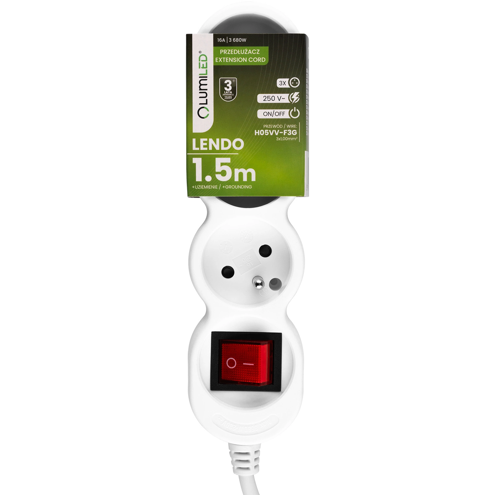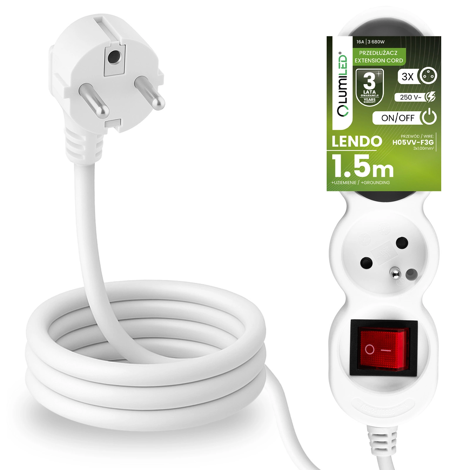 Przedłużacz Sieciowy Kabel z Uziemieniem Listwa Zasilająca 3 Gniazda 1.5m Włącznik ON/OFF Biały Sznur Lendo Lumiled