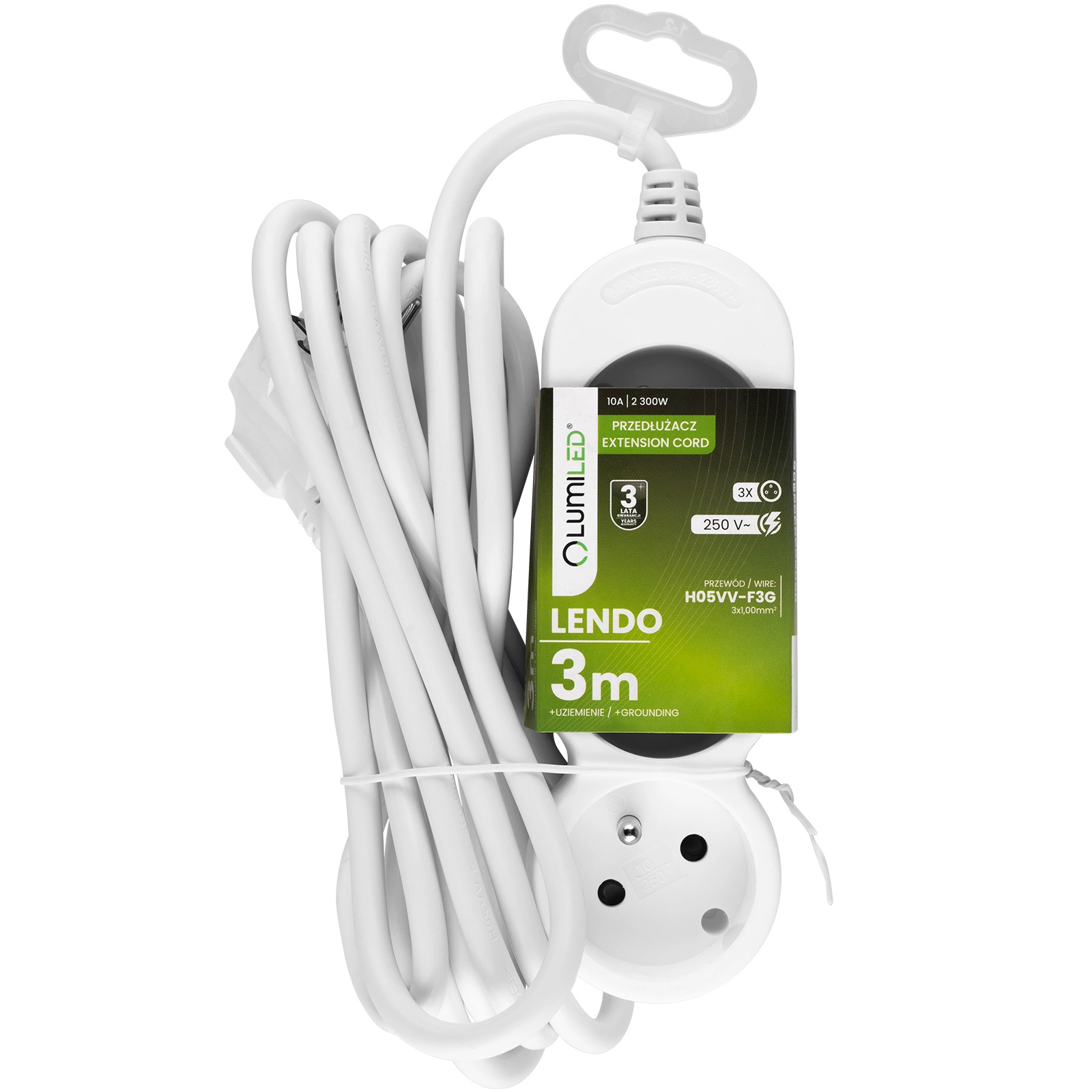 Przedłużacz Sieciowy Kabel z Uziemieniem Listwa Zasilająca 3 Gniazda 3m Biały Sznur Lendo Lumiled