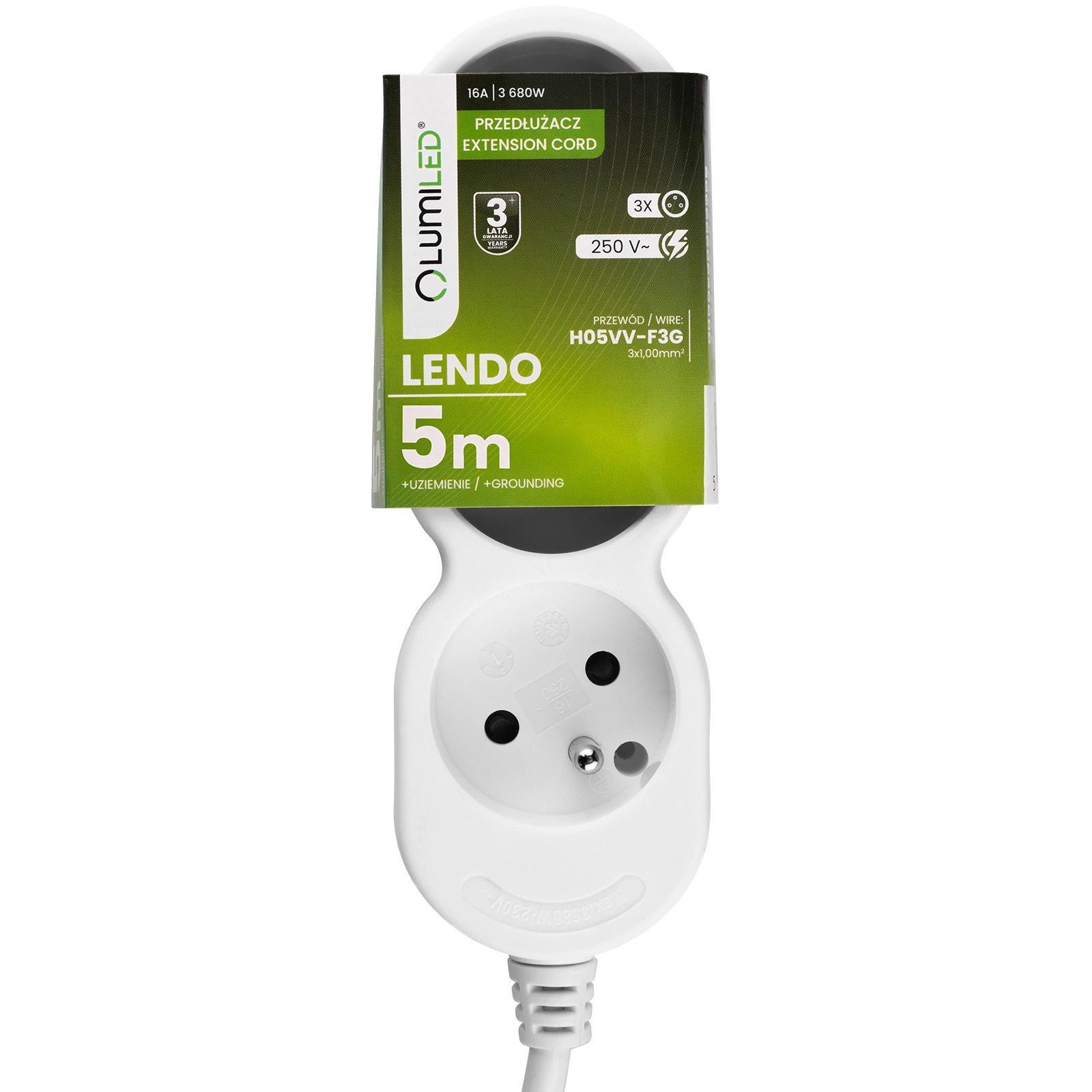 Przedłużacz Sieciowy Kabel z Uziemieniem Listwa Zasilająca 3 Gniazda 5m Biały Sznur Lendo Lumiled